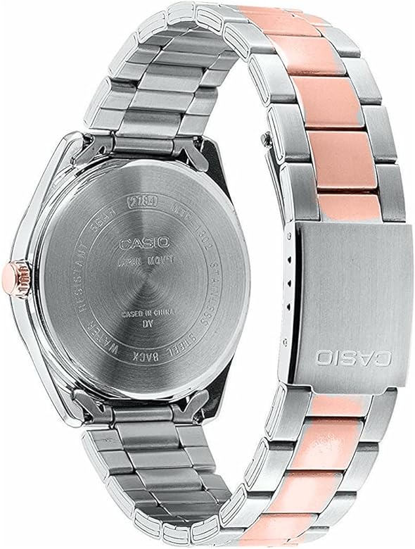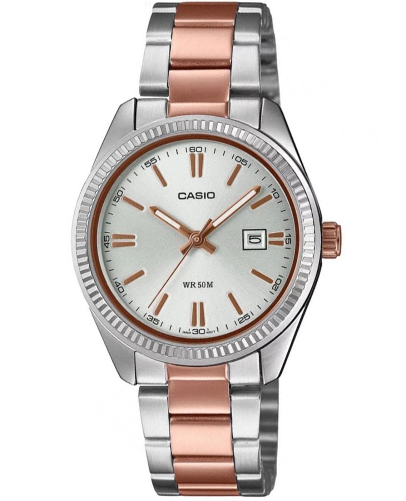 Японские женские часы Casio Collection LTP-1302PRG-7AVEF с минеральным стекломМинеральное стеклоМинеральное стекло представляет собой искусственно выращенный минерал кварца. Такое стекло отличается особой устойчивостью к повреждениям и царапинам. Уступает по некоторым качествам сапфировому стеклу.. Светящееся покрытие обеспечивает длительную подсветку в темное время суток после короткого воздействия света. Корпус выполнен из гипоаллергенной латуни. Модель комплектуется надёжным механизмом, точность хода которого составляет +/- 20 сек/мес. Стрелки с люминесцентным покрытиемЛюминесцентное покрытиеПозволяет считывать показания времени в темноте. Производители наносят на стрелки, часовые индексы, безель или поверхность циферблата светонакопительный состав, дающий холодное свечение.. Стальной браслет на раскладной застёжкеРаскладная застёжкаТакой тип застёжки используется только на браслетах из металла. Она никогда не раскрывается полностью, происходит разделение на 2 и более частей. Раскладывающая застёжка снизит вероятность потери часов к минимуму. с IP-покрытиемIP-покрытиеМетод ионного напыления. Демонстрирует повышенную устойчивость к истиранию, окислению и химическим веществам. Под воздействием высокого давления и температуры около 1500°C молекулы металла надёжно соединяются с частицами корпуса часов.. Окошко даты находится в положении 3 часа. Водонепроницаемость 50 метров, позволит защитить корпус от случайных брызг или капель дождя.