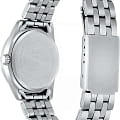 Циферблат дополнен лаконичным узором, часы отлично смотрятся в дополнении к повседневному образу. Циферблат защищен минеральным стекломМинеральное стеклоМинеральное стекло представляет собой искусственно выращенный минерал кварца. Такое стекло отличается особой устойчивостью к повреждениям и царапинам. Уступает по некоторым качествам сапфировому стеклу.. Полезными опциями являются отображение даты и дня недели, люминесцентная подсветкаЛюминесцентное покрытиеПозволяет считывать показания времени в темноте. Производители наносят на стрелки, часовые индексы, безель или поверхность циферблата светонакопительный состав, дающий холодное свечение.. Японский кварцевый механизм обеспечивает высокую точность хода +/- 20 сек/мес. Модель сделана из нержавеющей стали. Браслет с раскладной застёжкойРаскладная застёжкаТакой тип застёжки используется только на браслетах из металла. Она никогда не раскрывается полностью, происходит разделение на 2 и более частей. Раскладывающая застёжка снизит вероятность потери часов к минимуму..