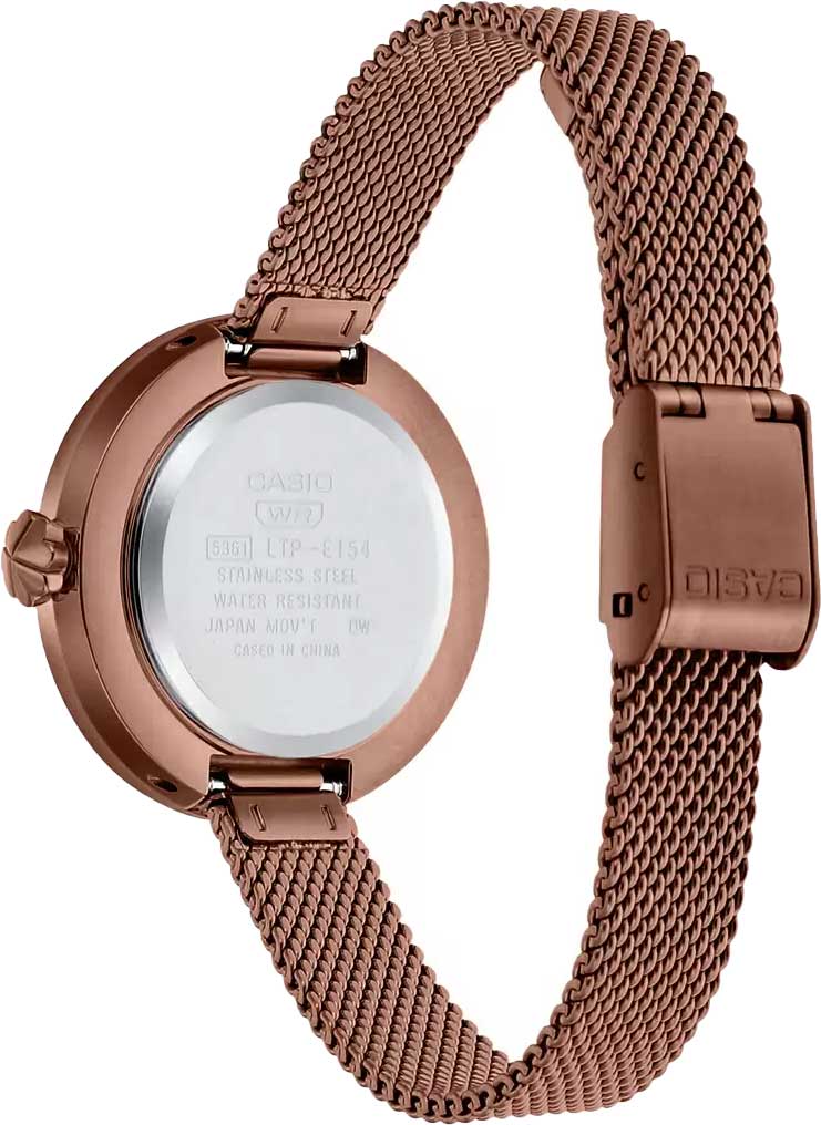 Японские женские часы LTP-E154MR-1A с минеральным стекломМинеральное стеклоМинеральное стекло представляет собой искусственно выращенный минерал кварца. Такое стекло отличается особой устойчивостью к повреждениям и царапинам. Уступает по некоторым качествам сапфировому стеклу. из коллекции LTP являются представителем линейки минималистичных и лаконичных моделей, подходящих для дополнения делового, повседневного образа, наряда для торжественных случаев.