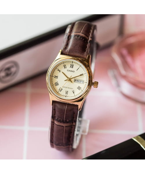 Японские женские часы LTP-V006GL-9B с минеральным стекломМинеральное стеклоМинеральное стекло представляет собой искусственно выращенный минерал кварца. Такое стекло отличается особой устойчивостью к повреждениям и царапинам. Уступает по некоторым качествам сапфировому стеклу. из коллекции LTP изящно смотрятся на запястье, они привлекают классическим исполнением и правильной геометрией. Минималистичная модель станет отличным решением для любого случая: на работу, переговоры с деловыми партнёрами, прогулку с друзьями или праздничный вечер. Отсутствуют лишние детали, что позволяет часам быть актуальными на долгие годы. Корпус выполнен из нержавеющей стали 316L с IP-покрытиемIP-покрытиеМетод ионного напыления. Демонстрирует повышенную устойчивость к истиранию, окислению и химическим веществам. Под воздействием высокого давления и температуры около 1500°C молекулы металла надёжно соединяются с частицами корпуса часов., отличающейся долговечностью и устойчивостью к повреждениям и царапинам. Модель комплектуется надёжным механизмом, точность хода которого составляет +/- 20 сек/мес. Кожаный ремешок на стандартной застёжке.