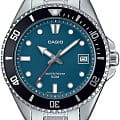 Японские мужские кварцевые часы с минеральным стекломМинеральное стеклоМинеральное стекло представляет собой искусственно выращенный минерал кварца. Такое стекло отличается особой устойчивостью к повреждениям и царапинам. Уступает по некоторым качествам сапфировому стеклу. Casio Collection MDV-10D-2A1V, кварцевый механизм с высокой точностью. Корпус и браслет часов изготовлены из нержавеющей стали. Вращающийся безельБезельВнешний ободок, закрепляющий стекло. В спортивных часах так называется поворотное кольцо с делениями на циферблате, выполняет роль таймера – замеряет отрезки времени на шкале. Неподвижный безель – элемент декора. Однонаправленно вращающийся безель на дайверских часах позволяет фиксировать моменты погружения и выныривания на поверхность. из нержавеющей стали с IP-покрытиемIP-покрытиеМетод ионного напыления. Демонстрирует повышенную устойчивость к истиранию, окислению и химическим веществам. Под воздействием высокого давления и температуры около 1500°C молекулы металла надёжно соединяются с частицами корпуса часов.. Стрелки и метки с люминесцентным покрытиемЛюминесцентное покрытиеПозволяет считывать показания времени в темноте. Производители наносят на стрелки, часовые индексы, безель или поверхность циферблата светонакопительный состав, дающий холодное свечение.. Окошко даты находится в положении 3 часа. Класс водозащиты: 50 метров, позволит защитить корпус от случайных брызг или капель дождя.