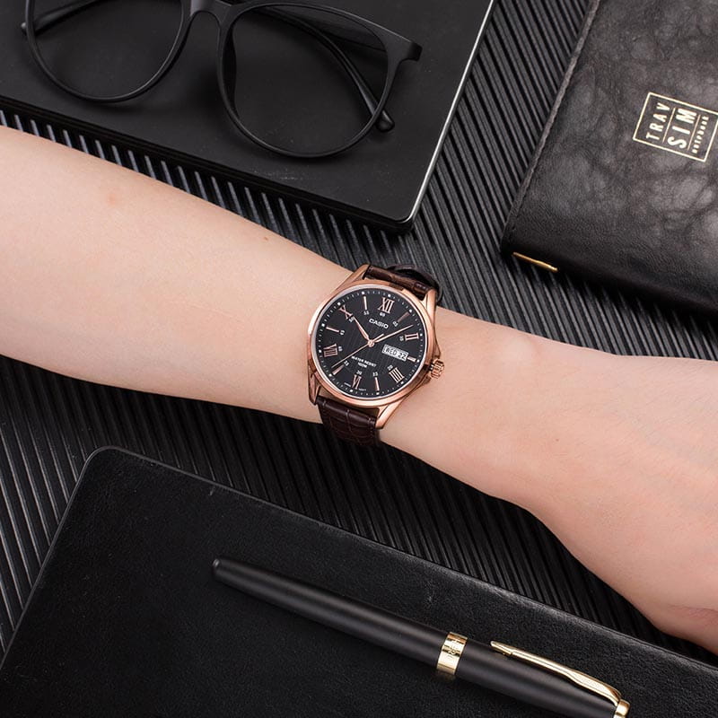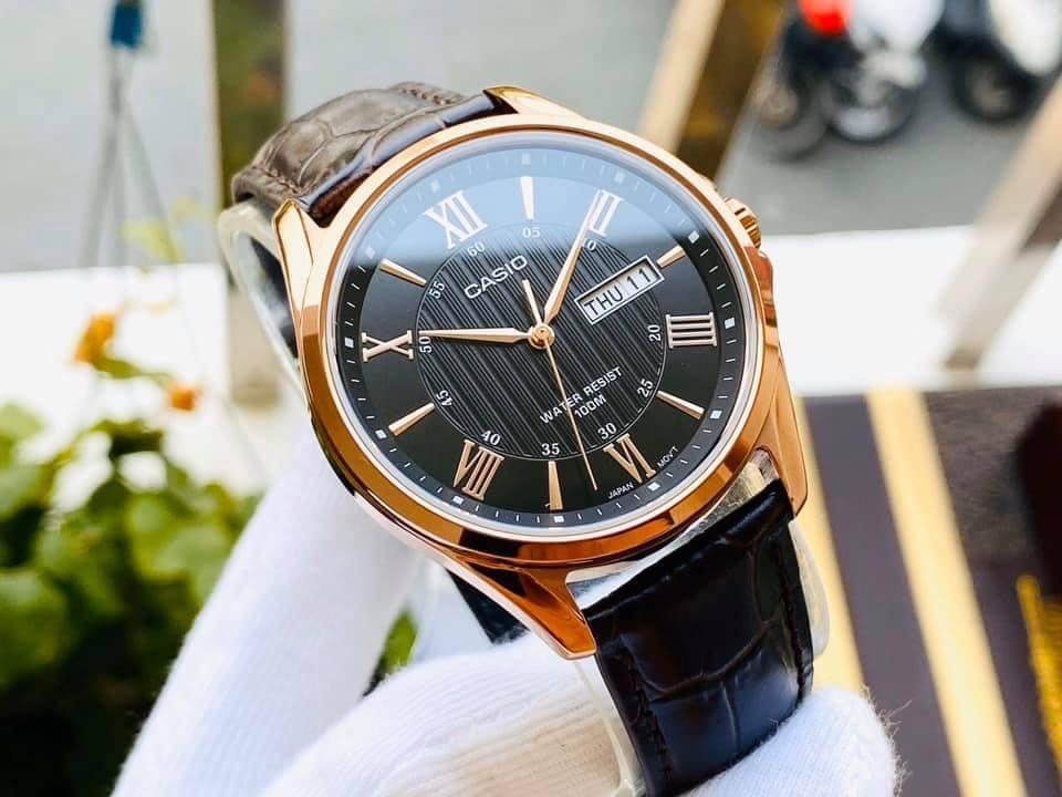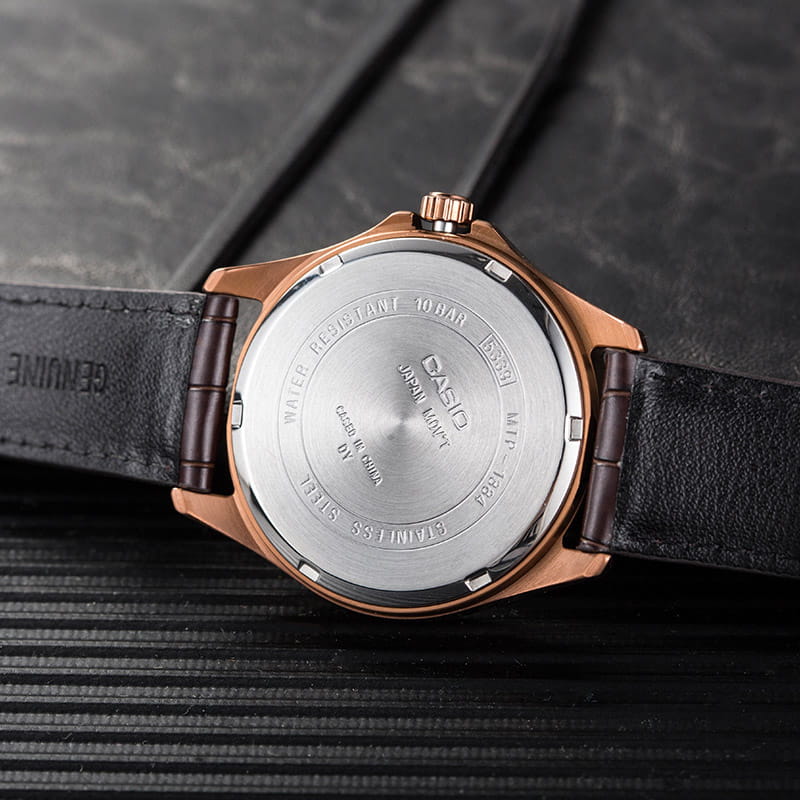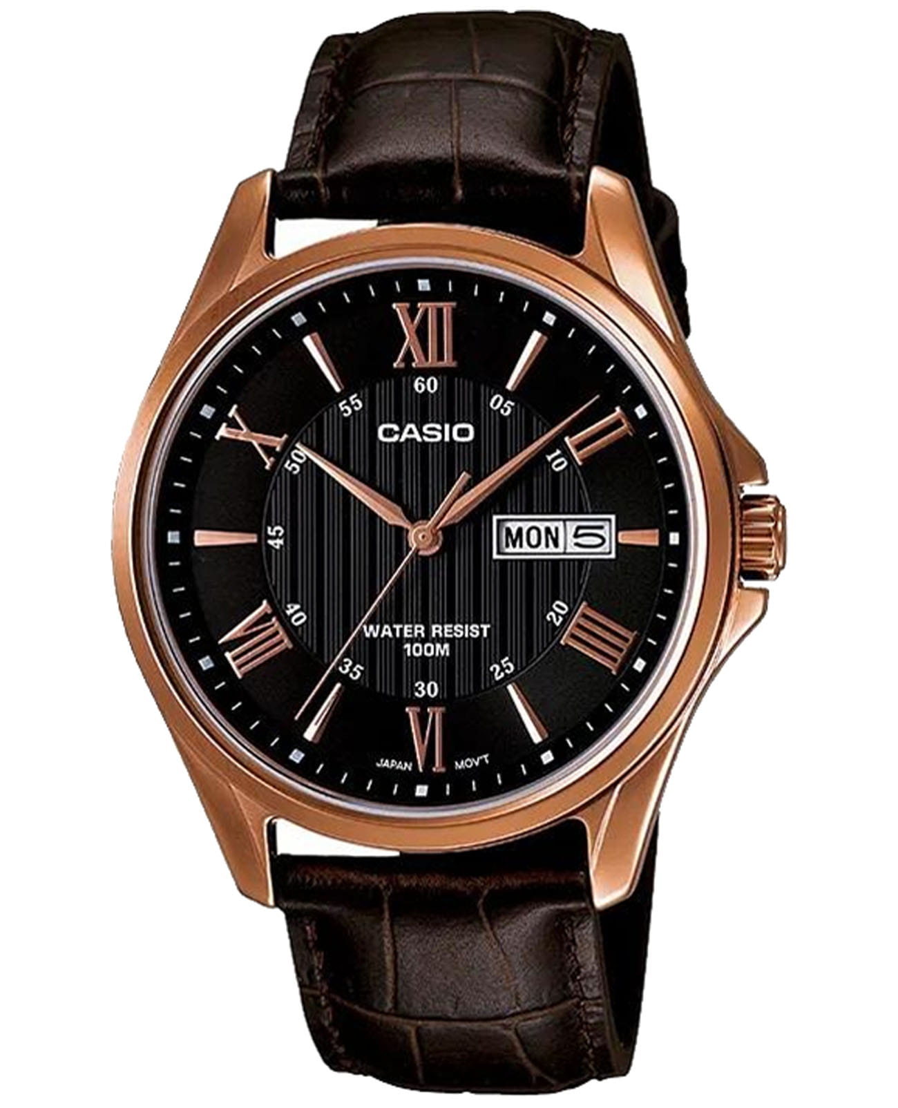 Японские мужские наручные часы с минеральным стекломМинеральное стеклоМинеральное стекло представляет собой искусственно выращенный минерал кварца. Такое стекло отличается особой устойчивостью к повреждениям и царапинам. Уступает по некоторым качествам сапфировому стеклу. Casio Collection MTP-1384L-1A, кварцевый механизм с высокой точностью. Класс водозащиты: 100 метров, позволит плавать, нырять и заниматься другими водными видами спорта. Корпус часов изготовлен из стали с IP-покрытиемIP-покрытиеМетод ионного напыления. Демонстрирует повышенную устойчивость к истиранию, окислению и химическим веществам. Под воздействием высокого давления и температуры около 1500°C молекулы металла надёжно соединяются с частицами корпуса часов.. Кожаный ремешок на стандартной застёжке. Окошки дня недели и даты находятся в положении 3 часа. Заводная головка с защитой. Задняя крышка с винтовым фиксатором.