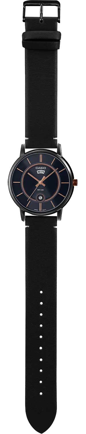Японские мужские наручные часы Casio Collection MTP-B120BL-1A с минеральным стекломМинеральное стеклоМинеральное стекло представляет собой искусственно выращенный минерал кварца. Такое стекло отличается особой устойчивостью к повреждениям и царапинам. Уступает по некоторым качествам сапфировому стеклу., кварцевый механизм с высокой точностью. Класс водозащиты: 50 метров, позволит защитить корпус от случайных брызг или капель дождя. Корпус часов изготовлен из стали с IP-покрытиемIP-покрытиеМетод ионного напыления. Демонстрирует повышенную устойчивость к истиранию, окислению и химическим веществам. Под воздействием высокого давления и температуры около 1500°C молекулы металла надёжно соединяются с частицами корпуса часов..Ремешок с классической застежкой. Указатель даты находится в положении 6 часов. Указатель дня недели находится в положении 12 часов. Батарея рассчитана на 3 года. Циферблат с метками в виде штрихов.