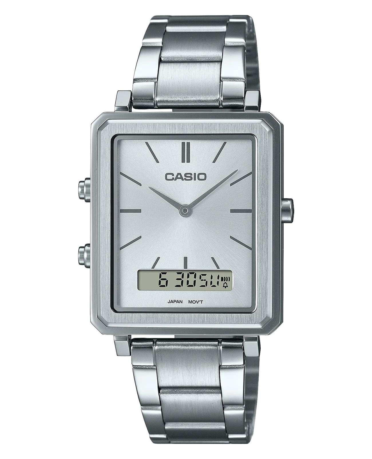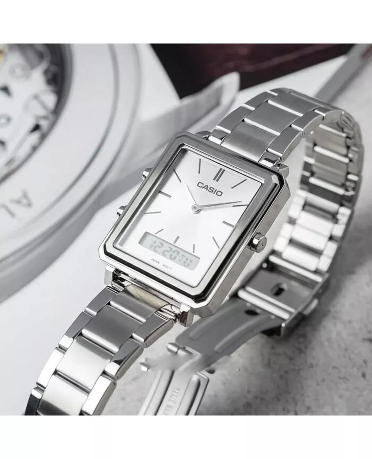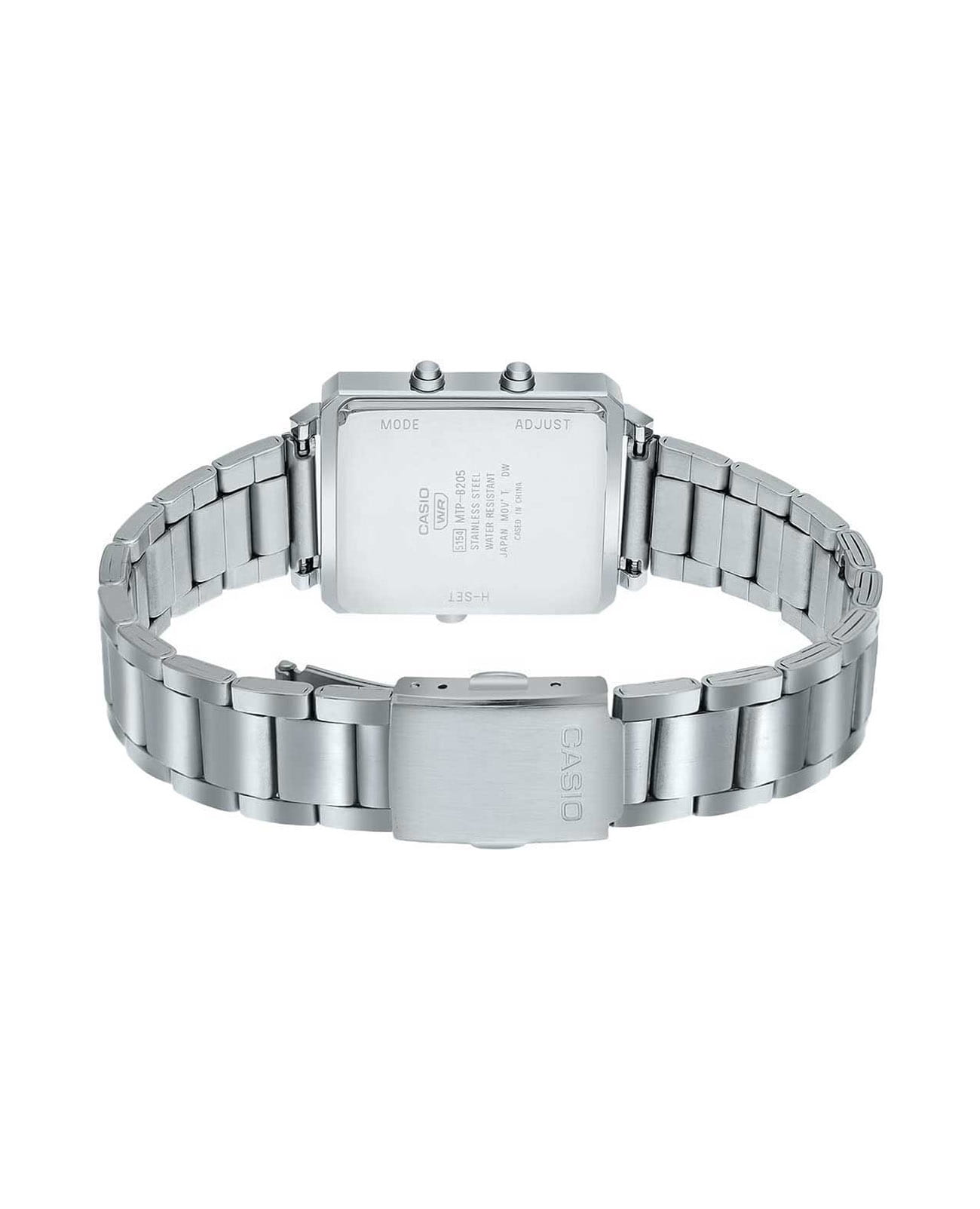 Японские мужские часы- хронографХронографФункция позволяет измерять отрезки времени с особой точностью: часы, минуты, секунды. Верным признаком хронографа является наличие на циферблате 3 дополнительных окошек-счётчиков. с минеральным стекломМинеральное стеклоМинеральное стекло представляет собой искусственно выращенный минерал кварца. Такое стекло отличается особой устойчивостью к повреждениям и царапинам. Уступает по некоторым качествам сапфировому стеклу. Casio Collection MTP-B205D-7EDF, кварцевый механизм с высокой точностью. Корпус часов изготовлен из стали. Мужские аналогово-цифровые часы. 12 и 24-часовой формат времени. СекундомерСекундомерСекундоме́р — прибор, способный измерять интервалы времени с точностью до долей секунды. с точностью показаний 1/100с и временем измерения 60мин. Второй часовой пояс. Циферблат с метками в виде штрихов выполнен по технологии Sunray (солнечные лучи). БудильникБудильникБуди́льник — часы, в заданный момент времени подающие звуковой, световой и/или в редких случаях другой сигнал., ежечасный сигнал. Батарея рассчитана на 3 года. Класс водозащиты: 50 метров, позволит защитить корпус от случайных брызг или капель дождя. Стальной браслет на раскладной застёжкеРаскладная застёжкаТакой тип застёжки используется только на браслетах из металла. Она никогда не раскрывается полностью, происходит разделение на 2 и более частей. Раскладывающая застёжка снизит вероятность потери часов к минимуму..
