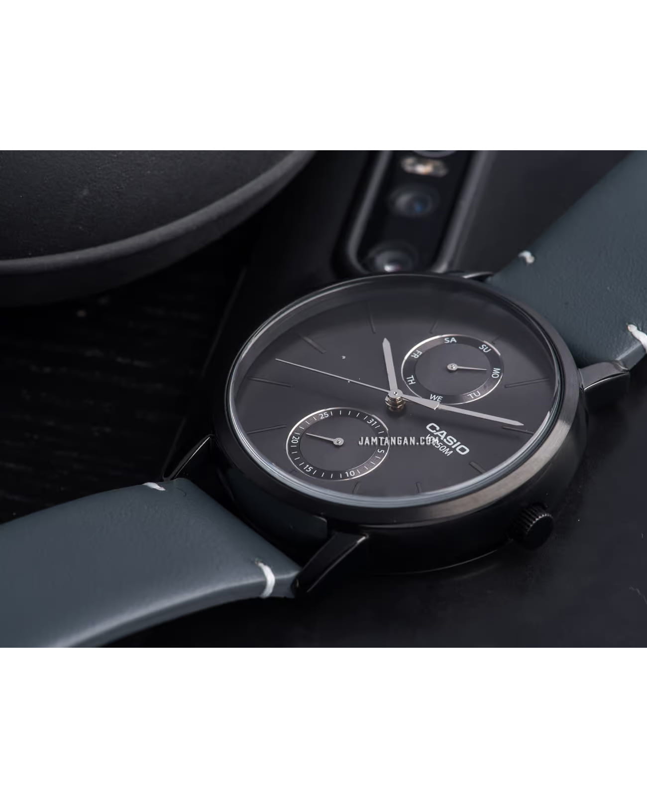 Японские мужские часы с минеральным стекломМинеральное стеклоМинеральное стекло представляет собой искусственно выращенный минерал кварца. Такое стекло отличается особой устойчивостью к повреждениям и царапинам. Уступает по некоторым качествам сапфировому стеклу. Casio Collection MTP-B310BL-1A, кварцевый механизм с высокой точностью. Корпус часов изготовлен из стали с IP-покрытиемIP-покрытиеМетод ионного напыления. Демонстрирует повышенную устойчивость к истиранию, окислению и химическим веществам. Под воздействием высокого давления и температуры около 1500°C молекулы металла надёжно соединяются с частицами корпуса часов.. Метки в виде штрихов. Число и день недели вынесены на отдельные циферблаты. Батарейка рассчитана на 3 года. Рифленая заводная головка. Класс водозащиты: 50 метров, позволит защитить корпус от случайных брызг или капель дождя. Кожаный ремешок на стандартной застёжке.