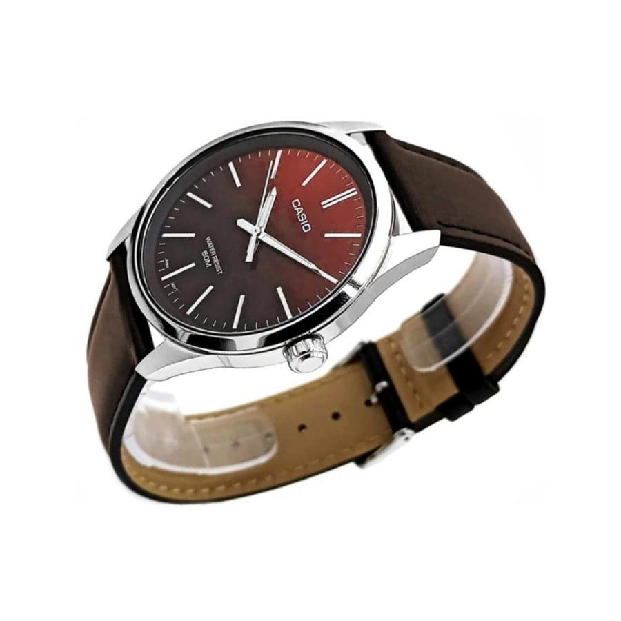 Японские мужские наручные часы с минеральным стекломМинеральное стеклоМинеральное стекло представляет собой искусственно выращенный минерал кварца. Такое стекло отличается особой устойчивостью к повреждениям и царапинам. Уступает по некоторым качествам сапфировому стеклу. Casio Collection MTP-E180L-5AVEF, кварцевый механизм с высокой точностью. Окошко даты с увеличительным стеклом. Класс водозащиты: 50 метров, позволит защитить корпус от случайных брызг или капель дождя. Корпус часов изготовлен из стали. Стрелки с люминесцентным покрытиемЛюминесцентное покрытиеПозволяет считывать показания времени в темноте. Производители наносят на стрелки, часовые индексы, безель или поверхность циферблата светонакопительный состав, дающий холодное свечение.. Кожаный ремешок на стандартной застёжке.