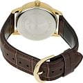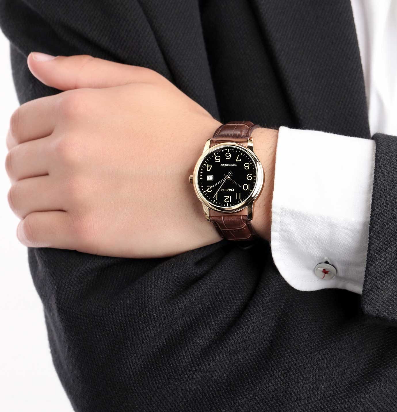 Мужские кварцевые часы Casio Collection — это удобный и практичный аксессуар на каждый день. Корпус размером 44 мм и толщиной 9,6 мм выполнен из металла с IP-покрытиемIP-покрытиеМетод ионного напыления. Демонстрирует повышенную устойчивость к истиранию, окислению и химическим веществам. Под воздействием высокого давления и температуры около 1500°C молекулы металла надёжно соединяются с частицами корпуса часов. цвета жёлтого золота. Циферблат чёрного цвета оформлен арабскими цифрами и стрелками. Окошко даты расположено в положении 3 часов. Циферблат защищён минеральным стекломМинеральное стеклоМинеральное стекло представляет собой искусственно выращенный минерал кварца. Такое стекло отличается особой устойчивостью к повреждениям и царапинам. Уступает по некоторым качествам сапфировому стеклу.. Заводная головка завинчивающаяся, что повышает надёжность. Часы оснащены кожаным ремешком на классической пряжке. Водонепроницаемость 30 м позволяет использовать часы в повседневных условиях. Идеальный выбор для тех, кто ценит японское качество и универсальный дизайн.