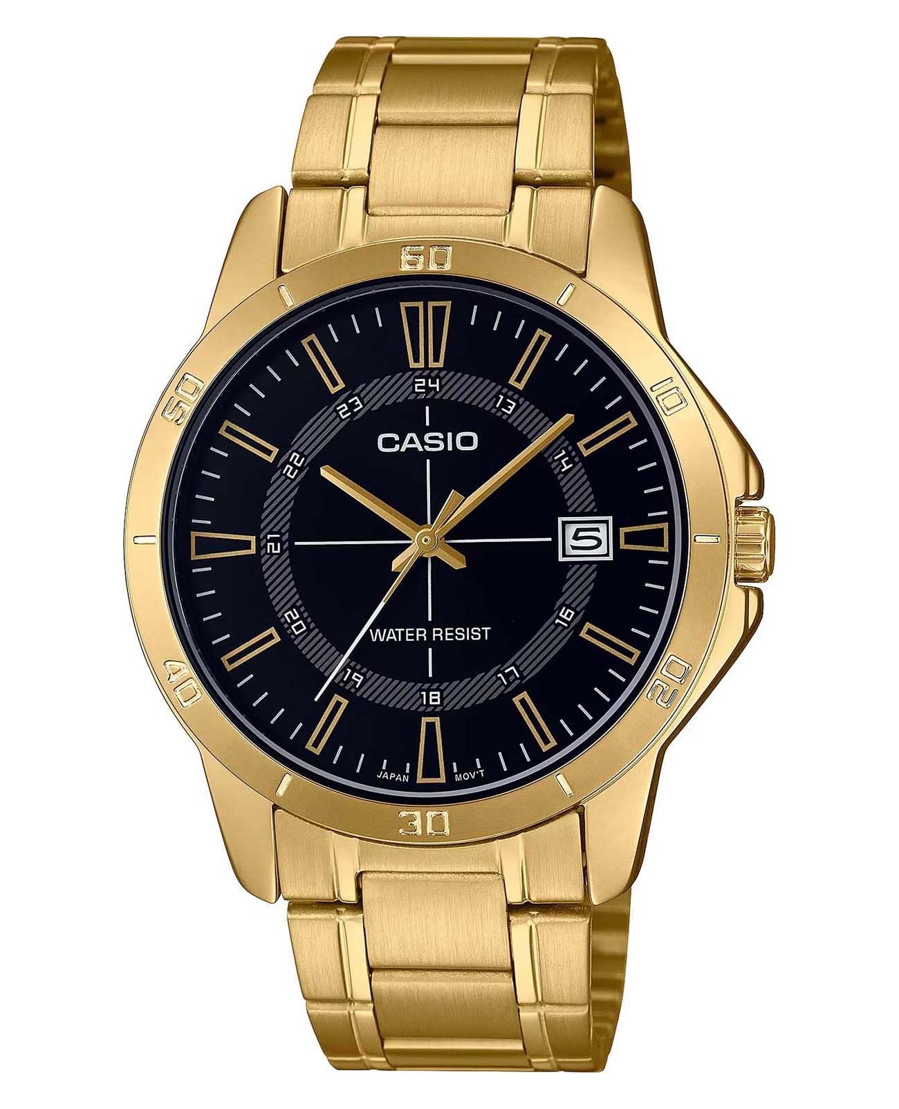 Японские мужские кварцевые часы с минеральным стекломМинеральное стеклоМинеральное стекло представляет собой искусственно выращенный минерал кварца. Такое стекло отличается особой устойчивостью к повреждениям и царапинам. Уступает по некоторым качествам сапфировому стеклу. Casio Collection MTP-V004G-1C, кварцевый механизм с высокой точностью. Корпус и браслет часов изготовлен из нержавеющей стали с IP-покрытиемIP-покрытиеМетод ионного напыления. Демонстрирует повышенную устойчивость к истиранию, окислению и химическим веществам. Под воздействием высокого давления и температуры около 1500°C молекулы металла надёжно соединяются с частицами корпуса часов.. Циферблат с метками в виде штрихов. Окошко даты находится в положении 3 часа. Класс водозащиты: 30 метров, позволит защитить корпус от случайных брызг или капель дождя. Стальной браслет на раскладной застёжкеРаскладная застёжкаТакой тип застёжки используется только на браслетах из металла. Она никогда не раскрывается полностью, происходит разделение на 2 и более частей. Раскладывающая застёжка снизит вероятность потери часов к минимуму..