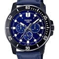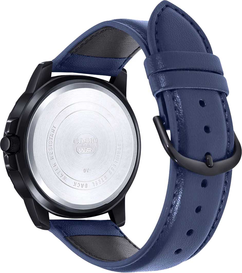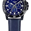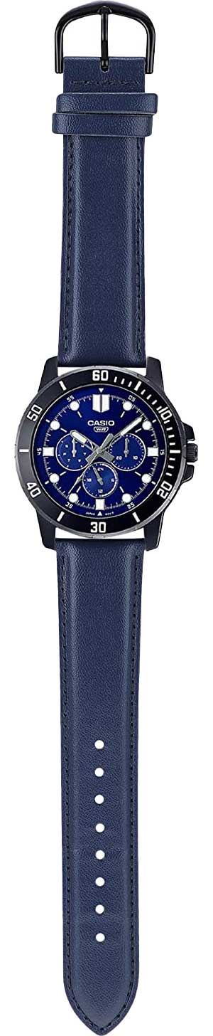 Отличная модель часов, которая станет идеальным вариантом на каждый день. Японские мужские часы с минеральным стекломМинеральное стеклоМинеральное стекло представляет собой искусственно выращенный минерал кварца. Такое стекло отличается особой устойчивостью к повреждениям и царапинам. Уступает по некоторым качествам сапфировому стеклу. Casio Collection MTP-VD300BL-2E, кварцевый механизм с высокой точностью. Корпус часов изготовлен из стали с IP-покрытиемIP-покрытиеМетод ионного напыления. Демонстрирует повышенную устойчивость к истиранию, окислению и химическим веществам. Под воздействием высокого давления и температуры около 1500°C молекулы металла надёжно соединяются с частицами корпуса часов.. Люминесцентная подсветкаЛюминесцентное покрытиеПозволяет считывать показания времени в темноте. Производители наносят на стрелки, часовые индексы, безель или поверхность циферблата светонакопительный состав, дающий холодное свечение.. 12-ти и 24-х часовой формат времени, число и день недели вынесены на отдельные циферблаты. Метки в виде штрихов и точек. Заводная головка с защитой. Ремешок с классической застежкой.