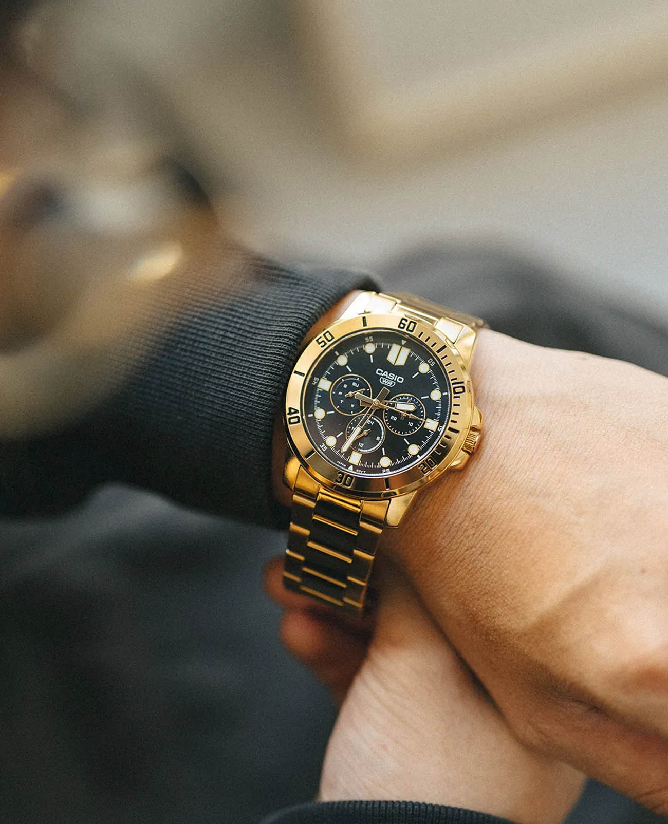 Японские мужские кварцевые часы с минеральным стекломМинеральное стеклоМинеральное стекло представляет собой искусственно выращенный минерал кварца. Такое стекло отличается особой устойчивостью к повреждениям и царапинам. Уступает по некоторым качествам сапфировому стеклу. Casio Collection MTP-VD300G-1E, кварцевый механизм с высокой точностью. Корпус и барслет часов изготовлены из нержавеющей стали с IP-покрытиемIP-покрытиеМетод ионного напыления. Демонстрирует повышенную устойчивость к истиранию, окислению и химическим веществам. Под воздействием высокого давления и температуры около 1500°C молекулы металла надёжно соединяются с частицами корпуса часов.. 12-ти и 24-х часовой формат времени, число и день недели вынесены на отдельные циферблаты. Циферблат с метками в виде точек и штрихов. Стрелки с люминесцентным покрытиемЛюминесцентное покрытиеПозволяет считывать показания времени в темноте. Производители наносят на стрелки, часовые индексы, безель или поверхность циферблата светонакопительный состав, дающий холодное свечение.. Заводная головка с защитой. Батарея рассчитана на 3 года. Класс водозащиты: 30 метров, позволит защитить корпус от случайных брызг или капель дождя. Стальной браслет на раскладной застёжкеРаскладная застёжкаТакой тип застёжки используется только на браслетах из металла. Она никогда не раскрывается полностью, происходит разделение на 2 и более частей. Раскладывающая застёжка снизит вероятность потери часов к минимуму..