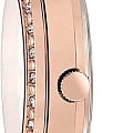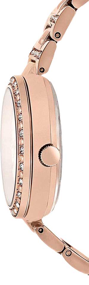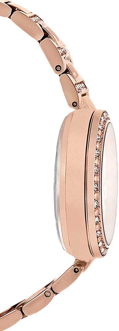Перламутроый циферблат с кристаллами идеально смотрится в сочетании с цветом розового золота, такой оттенок был получен благодаря нанесению IP-покрытияIP-покрытиеМетод ионного напыления. Демонстрирует повышенную устойчивость к истиранию, окислению и химическим веществам. Под воздействием высокого давления и температуры около 1500°C молекулы металла надёжно соединяются с частицами корпуса часов.. В качестве декорирующих элементов использованы оригинальные кристаллы Swarovski с роскошным сиянием. Корпус и браслет выполнены из долговечной стали. циферблат защинен минеральным стекломМинеральное стеклоМинеральное стекло представляет собой искусственно выращенный минерал кварца. Такое стекло отличается особой устойчивостью к повреждениям и царапинам. Уступает по некоторым качествам сапфировому стеклу.. 12-ти и 24-х часовой формат 12-ти и 24-х часовой формат времени и число вынесены на отдельные циферблаты. Ретроградный указатель дня недели.