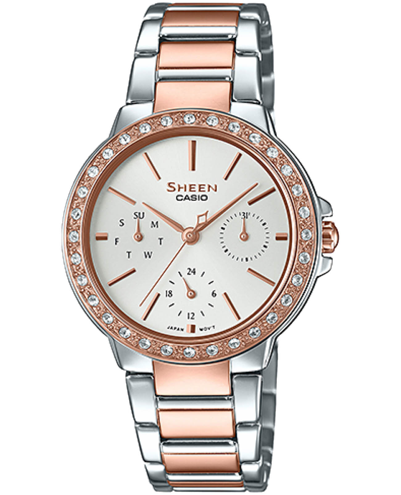 Женские японские наручные часы Casio Sheen SHE-3069SPG-7AUDF, кварцевый механизм с высокой точностью. Сапфировое стекло устойчивое к появлению царапин, обладающее высокой прозрачностью. Класс водозащиты: 50 метров, позволит защитить корпус от случайных брызг или капель дождя. БезельБезельВнешний ободок, закрепляющий стекло. В спортивных часах так называется поворотное кольцо с делениями на циферблате, выполняет роль таймера – замеряет отрезки времени на шкале. Неподвижный безель – элемент декора. Однонаправленно вращающийся безель на дайверских часах позволяет фиксировать моменты погружения и выныривания на поверхность. с IP-покрытиемIP-покрытиеМетод ионного напыления. Демонстрирует повышенную устойчивость к истиранию, окислению и химическим веществам. Под воздействием высокого давления и температуры около 1500°C молекулы металла надёжно соединяются с частицами корпуса часов. украшен кристаллами. 24-часовой формат времени, дата и день недели отображены на отдельных циферблатах.