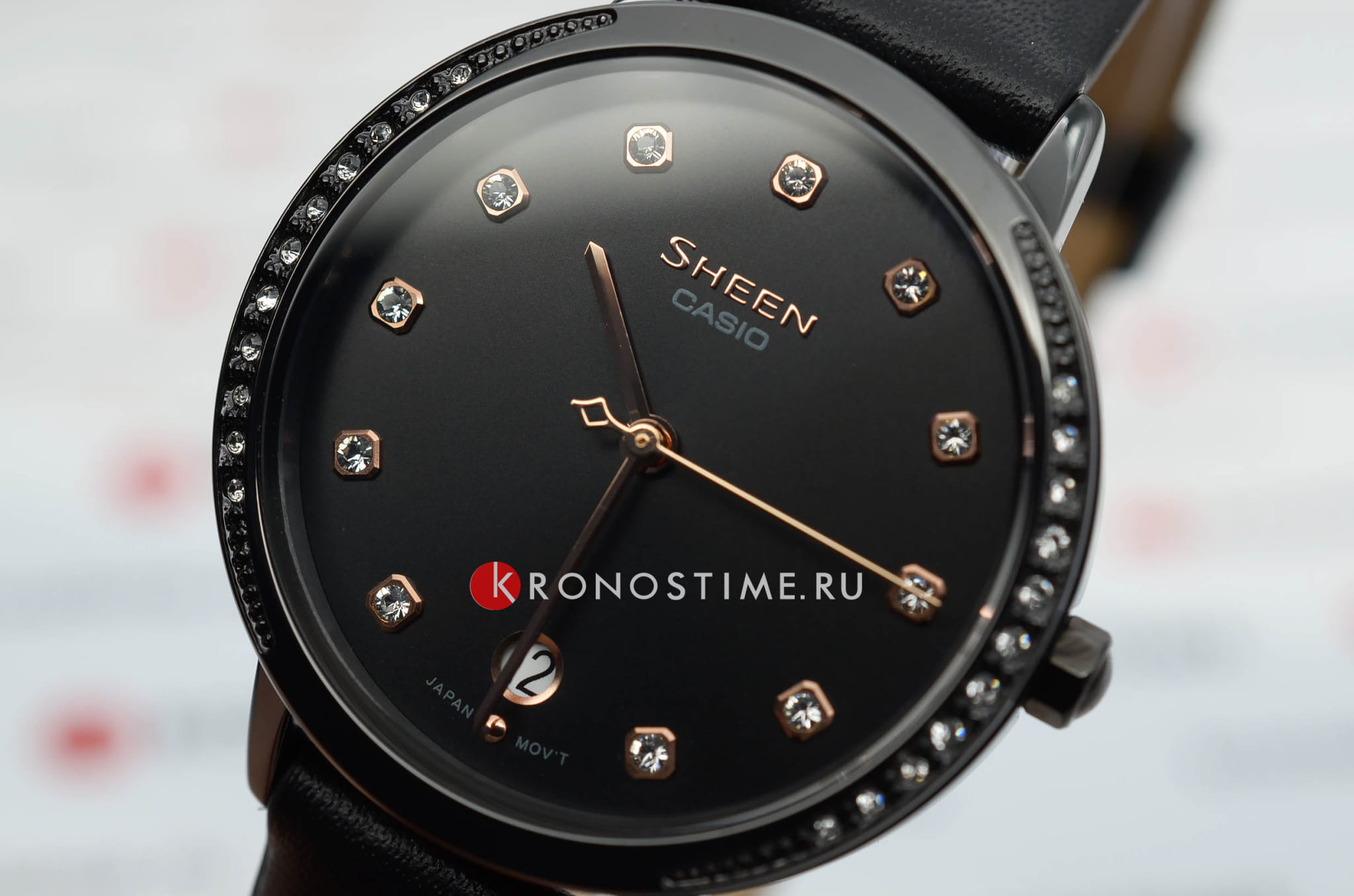 Японские женские часы с минеральным стекломМинеральное стеклоМинеральное стекло представляет собой искусственно выращенный минерал кварца. Такое стекло отличается особой устойчивостью к повреждениям и царапинам. Уступает по некоторым качествам сапфировому стеклу. Casio Sheen SHE-4056BL-1A, кварцевый механизм с высокой точностью. Класс водозащиты: 50 метров, позволит защитить корпус от случайных брызг или капель дождя. Корпус часов изготовлен из стали с IP-покрытиемIP-покрытиеМетод ионного напыления. Демонстрирует повышенную устойчивость к истиранию, окислению и химическим веществам. Под воздействием высокого давления и температуры около 1500°C молекулы металла надёжно соединяются с частицами корпуса часов..