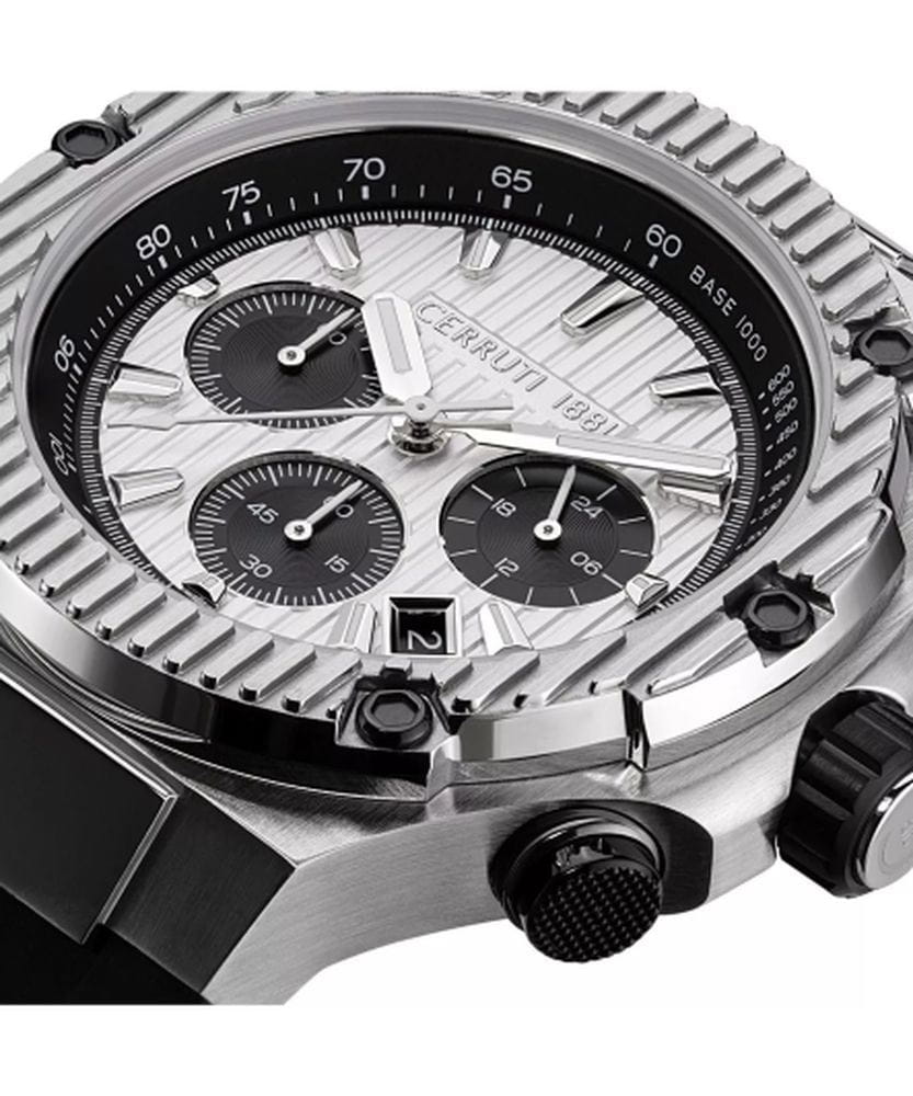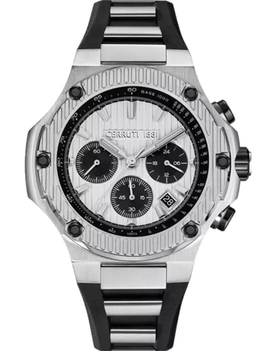 Cerruti 1881 CIWGO0050604 — выразительные мужские часы с современным архитектурным дизайном, сочетающие спортивную мощь и итальянскую утончённость. Корпус из нержавеющей стали с фактурным шестигранным безелемБезельВнешний ободок, закрепляющий стекло. В спортивных часах так называется поворотное кольцо с делениями на циферблате, выполняет роль таймера – замеряет отрезки времени на шкале. Неподвижный безель – элемент декора. Однонаправленно вращающийся безель на дайверских часах позволяет фиксировать моменты погружения и выныривания на поверхность. подчёркивает индустриальный характер модели, а насыщенный циферблат с тремя счётчиками хронографаХронографФункция позволяет измерять отрезки времени с особой точностью: часы, минуты, секунды. Верным признаком хронографа является наличие на циферблате 3 дополнительных окошек-счётчиков. создаёт динамичную композицию. Контрастные стрелки и метки с люминесцентным покрытиемЛюминесцентное покрытиеПозволяет считывать показания времени в темноте. Производители наносят на стрелки, часовые индексы, безель или поверхность циферблата светонакопительный состав, дающий холодное свечение. обеспечивают превосходную читаемость, а прочное минеральное стеклоМинеральное стеклоМинеральное стекло представляет собой искусственно выращенный минерал кварца. Такое стекло отличается особой устойчивостью к повреждениям и царапинам. Уступает по некоторым качествам сапфировому стеклу. надёжно защищает циферблат. Мягкий силиконовый ремешок с интегрированным дизайном гармонирует с цветовой палитрой корпуса и обеспечивает комфортное прилегание к запястью. Cerruti 1881 — это стильный союз технологий, функциональности и узнаваемого итальянского характера, идеально подходящий для активного и уверенного мужчины.