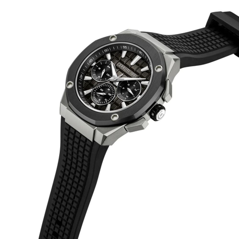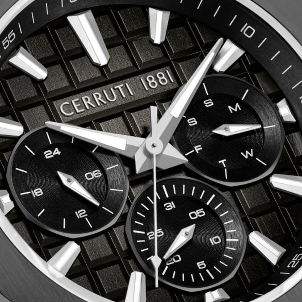 Cerruti 1881 CIWGQ0073401 — стильные мужские часы с выразительным индустриальным дизайном, в которых сочетаются спортивная энергия и итальянская элегантность. Корпус из нержавеющей стали с массивным безелемБезельВнешний ободок, закрепляющий стекло. В спортивных часах так называется поворотное кольцо с делениями на циферблате, выполняет роль таймера – замеряет отрезки времени на шкале. Неподвижный безель – элемент декора. Однонаправленно вращающийся безель на дайверских часах позволяет фиксировать моменты погружения и выныривания на поверхность. с PVD-покрытиемPVDУльтратонкое покрытие наносится в технике вакуумного напыления, сочетает в себе нитрид титана особой прочности со слоем золота или оксида хрома. Несёт в себе декоративную или защитную функцию. и декоративными винтами придаёт модели мощный и мужественный облик. Глубокий циферблат с тремя счётчиками хронографаХронографФункция позволяет измерять отрезки времени с особой точностью: часы, минуты, секунды. Верным признаком хронографа является наличие на циферблате 3 дополнительных окошек-счётчиков. подчёркивает технический характер часов, а контрастные стрелки и метки с люминесцентным покрытиемЛюминесцентное покрытиеПозволяет считывать показания времени в темноте. Производители наносят на стрелки, часовые индексы, безель или поверхность циферблата светонакопительный состав, дающий холодное свечение. обеспечивают отличную читаемость при любом освещении. Прочное минеральное стеклоМинеральное стеклоМинеральное стекло представляет собой искусственно выращенный минерал кварца. Такое стекло отличается особой устойчивостью к повреждениям и царапинам. Уступает по некоторым качествам сапфировому стеклу. защищает циферблат от царапин, а эластичный силиконовый ремешок гарантирует комфорт при повседневном ношении. Cerruti 1881 — гармоничное сочетание функциональности, надёжности и узнаваемого итальянского стиля, идеально подходящее для активных и уверенных мужчин.