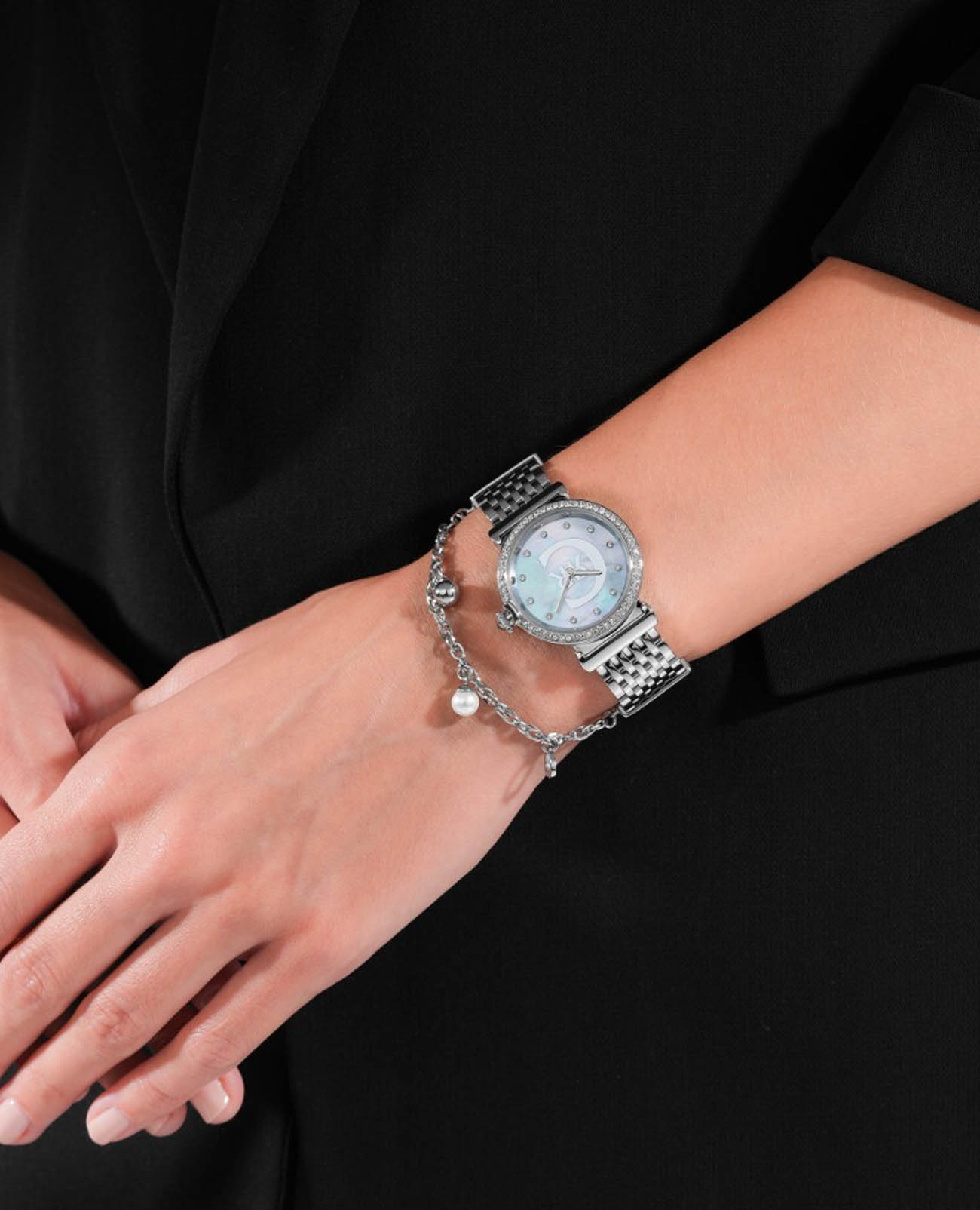 Французские женские часы с кристаллами Cerruti 1881 Corniglia CIWLG2226206, кварцевый механизм с высокой точностью. Часы с запоминающейся деталью, в виде дополнительной цепочки с подвесками. Минеральное стеклоМинеральное стеклоМинеральное стекло представляет собой искусственно выращенный минерал кварца. Такое стекло отличается особой устойчивостью к повреждениям и царапинам. Уступает по некоторым качествам сапфировому стеклу. устойчивое к мелким механическим повреждениям. Корпус часов изготовлен из стали. БезельБезельВнешний ободок, закрепляющий стекло. В спортивных часах так называется поворотное кольцо с делениями на циферблате, выполняет роль таймера – замеряет отрезки времени на шкале. Неподвижный безель – элемент декора. Однонаправленно вращающийся безель на дайверских часах позволяет фиксировать моменты погружения и выныривания на поверхность. украшен кристаллами. Циферблат украшен кристаллами, римские метки. Класс водозащиты: 30 метров, позволит защитить корпус от случайных брызг или капель дождя. Стальной браслет на застёжке-бабочке с кнопкамиЗастёжка "бабочка"Такой вид застёжки дополняется предохранителями, помогающими избежать случайного раскрытия браслета. Обладают изящным исполнением. .