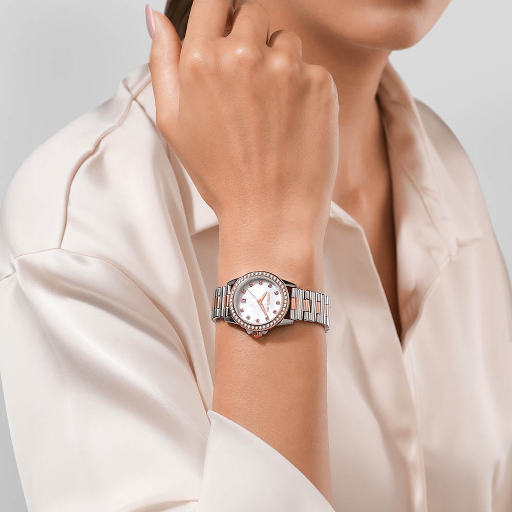 Корпус часов выполнен из стали, украшенный сверкающими кристаллами и цирконами, что придаёт часам неповторимое сияние. Циферблат, также украшенный кристаллами, создаёт атмосферу утончённой женственности. Стрелки с люминесцентным покрытиемЛюминесцентное покрытиеПозволяет считывать показания времени в темноте. Производители наносят на стрелки, часовые индексы, безель или поверхность циферблата светонакопительный состав, дающий холодное свечение. облегчают чтение времени даже в условиях слабого освещения.
