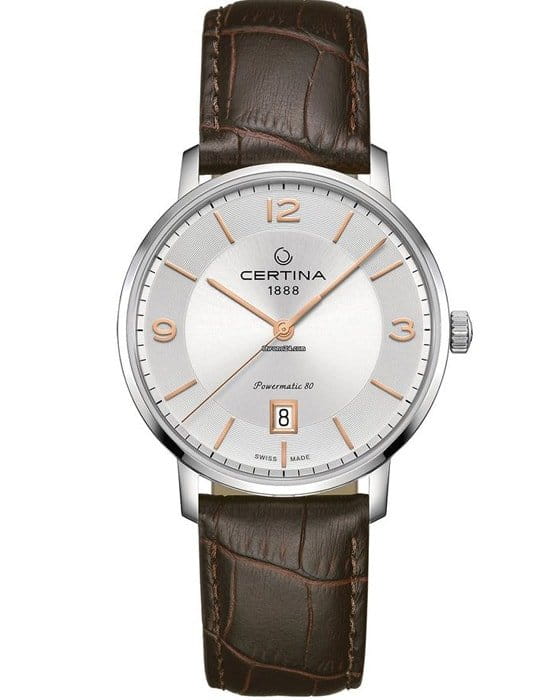 Лаконичный аксессуар с плавными линиями станет превосходным подарком для любителей элегантных и стильных аксессуаров. Часы с автоматической системой завода оснащены пружинным механизмом ETA Powermatic 80Powermatic 80Эксклюзивный калибр от швейцарской компании ETA с увеличенным запасом хода до 80 часов за счёт удлинённой заводной пружины. Характеризуется улучшенной системой спуска со сниженным трением. швейцарского производства, запас хода которого равен 80-ти часам. Скелетонизированная задняя крышка. Стекло из сапфира. Ремешок из натуральной кожи с имитацией рисунка кожи крокодила. Корпус из стали 316L. Соблюдение DS ConceptDS ConceptDouble Security Concept, обозначает двойную надёжность и безупречную точность часов Certina. Двойная система защиты подразумевает обеспечение максимальной устойчивости к ударам и высоких показателей водонепроницаемости.. Водонепроницаемость 10 бар. Отображение числа. Диаметр корпуса: 39 мм.