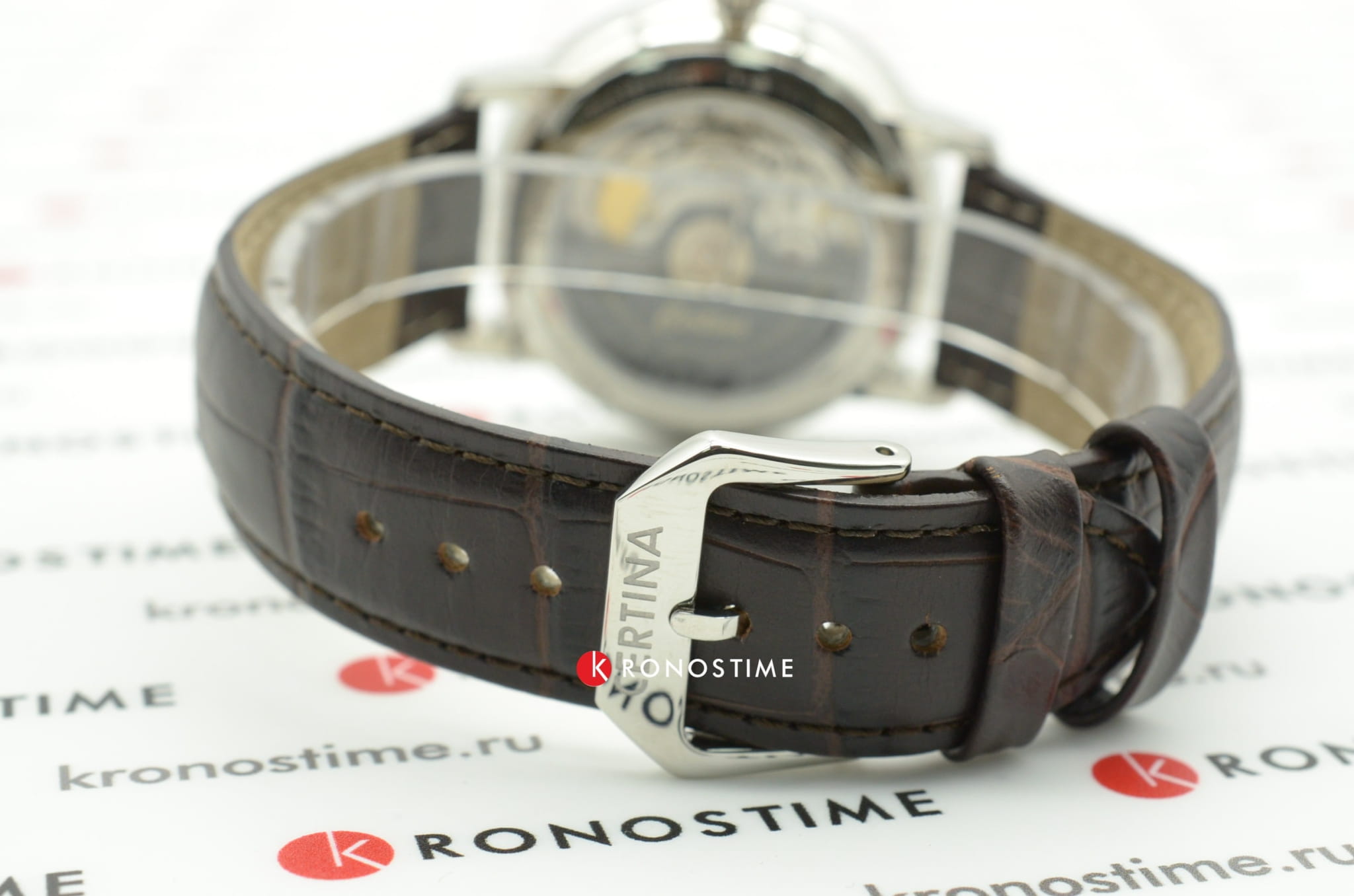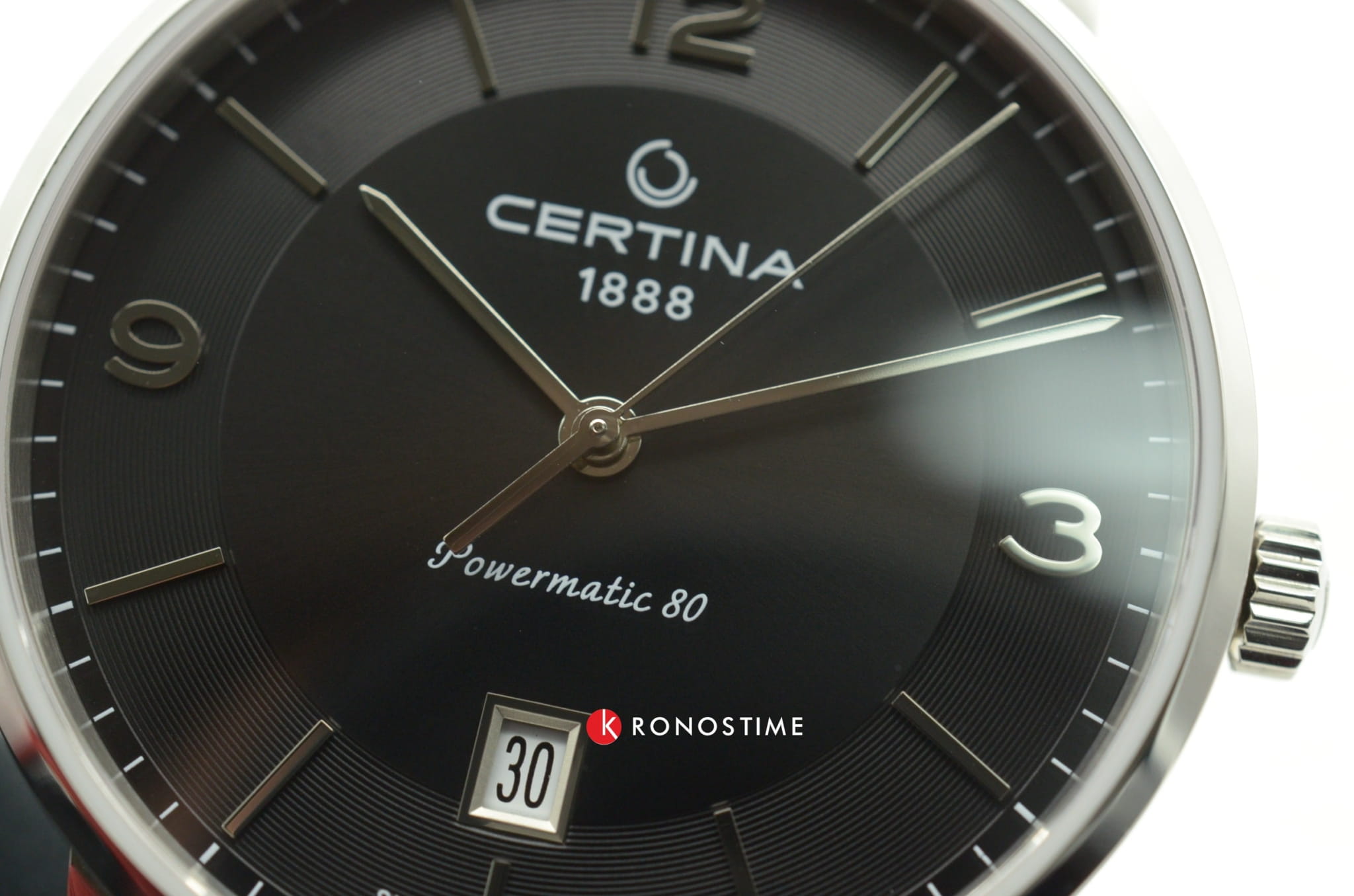 Модель выполнена в классическом стиле, благодаря чему она сохраняет актуальность во все времена. Цифру 6 заменяет прямоугольное окошко индикации текущего числа. Часы заводятся от движений руки носителя, швейцарский механизм ETA Powermatic 80Powermatic 80Эксклюзивный калибр от швейцарской компании ETA с увеличенным запасом хода до 80 часов за счёт удлинённой заводной пружины. Характеризуется улучшенной системой спуска со сниженным трением. сохраняет запас хода до 80-часов. Прозрачная задняя крышка. Сапфировое стекло. Стальной корпус с реализацией концепции DS ConceptDS ConceptDouble Security Concept, обозначает двойную надёжность и безупречную точность часов Certina. Двойная система защиты подразумевает обеспечение максимальной устойчивости к ударам и высоких показателей водонепроницаемости.. Ремешок из натуральной кожи. Водонепроницаемость 10 бар. Диаметр корпуса: 39 мм.