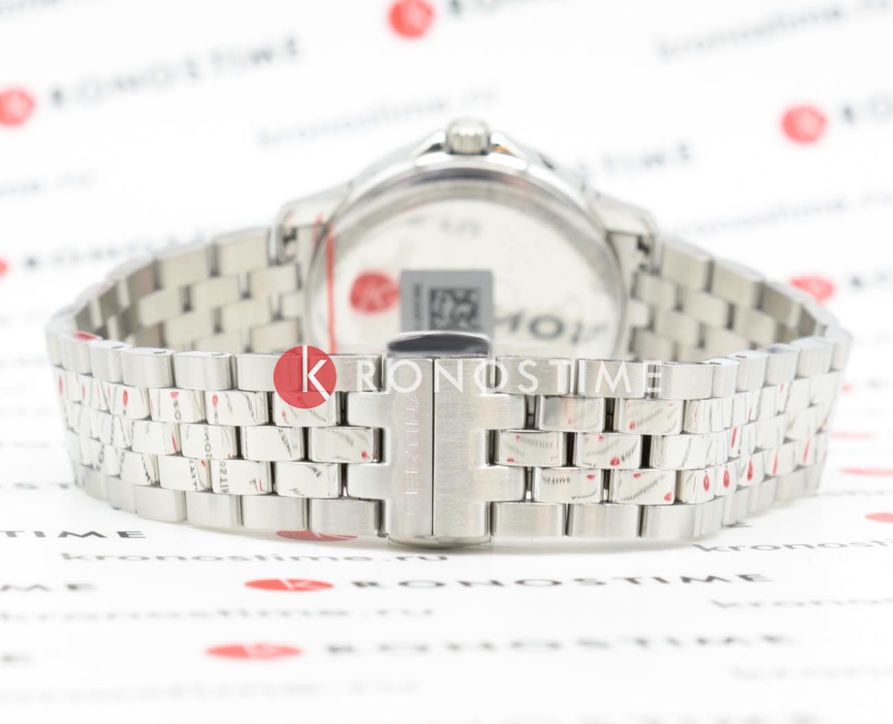Стальной браслет из нескольких рядов переплетающихся звеньев элегантно выглядит на запястье. Ударопрочность и водонепроницаемость 10 бар – концепция DS ConceptDS ConceptDouble Security Concept, обозначает двойную надёжность и безупречную точность часов Certina. Двойная система защиты подразумевает обеспечение максимальной устойчивости к ударам и высоких показателей водонепроницаемости.. Одностороннее антибликовое покрытие стекла из сапфира. . Индикация текущего числа, функция EOLEOLПредставляет собой систему, уведомляющую владельца часов о необходимости замены элемента питания. За 2 недели до полного разряда батарейки секундная стрелка перестаёт ходить чётко и начинает перепрыгивать на 3-4 деления.. Диаметр корпуса: 31 мм.