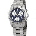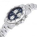 Компактный хронографХронографФункция позволяет измерять отрезки времени с особой точностью: часы, минуты, секунды. Верным признаком хронографа является наличие на циферблате 3 дополнительных окошек-счётчиков. работает за счёт швейцарского кварцевого механизма ETA 251.272. Синий циферблат защищён сапфировым стеклом. Водонепроницаемость сохраняется при давлении 10 бар. Стальной корпус дополнен однонаправленно вращающимся безелемБезельВнешний ободок, закрепляющий стекло. В спортивных часах так называется поворотное кольцо с делениями на циферблате, выполняет роль таймера – замеряет отрезки времени на шкале. Неподвижный безель – элемент декора. Однонаправленно вращающийся безель на дайверских часах позволяет фиксировать моменты погружения и выныривания на поверхность..