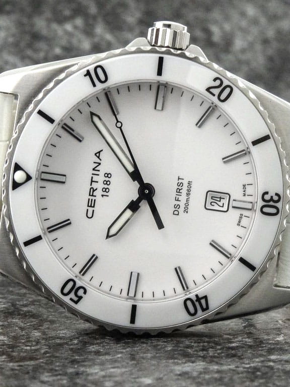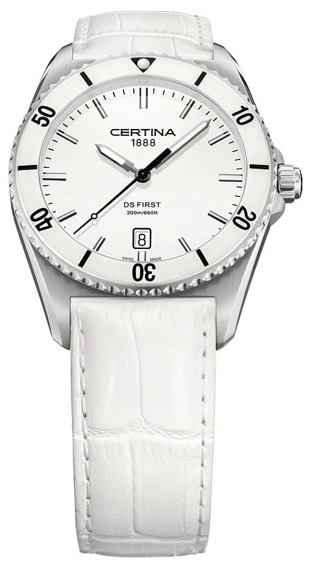 Швейцарские мужские часы Certina DS First C014.410.16.011.00 – классический аксессуар для делового образа. Стальной корпус оснащён чёрным керамическим безелемБезельВнешний ободок, закрепляющий стекло. В спортивных часах так называется поворотное кольцо с делениями на циферблате, выполняет роль таймера – замеряет отрезки времени на шкале. Неподвижный безель – элемент декора. Однонаправленно вращающийся безель на дайверских часах позволяет фиксировать моменты погружения и выныривания на поверхность., устойчивым к царапинам. Сапфировое стеклоСапфировое стеклоПрочный и надёжный материал из кристалла сапфира синтетического происхождения, характеризующийся особой твёрдостью и устойчивостью к царапинам и повреждениям. дополнено покрытием «антиблик». Швейцарский кварцевый механизм ETA 955.112 отличается высокой точностью хода. Кожаный ремешок надёжно обхватывает запястье. Индикатор разряда батарейки EOLEOLПредставляет собой систему, уведомляющую владельца часов о необходимости замены элемента питания. За 2 недели до полного разряда батарейки секундная стрелка перестаёт ходить чётко и начинает перепрыгивать на 3-4 деления.