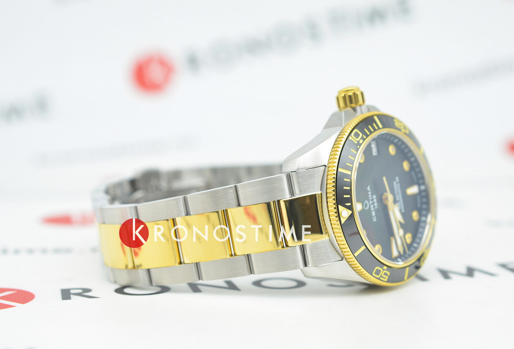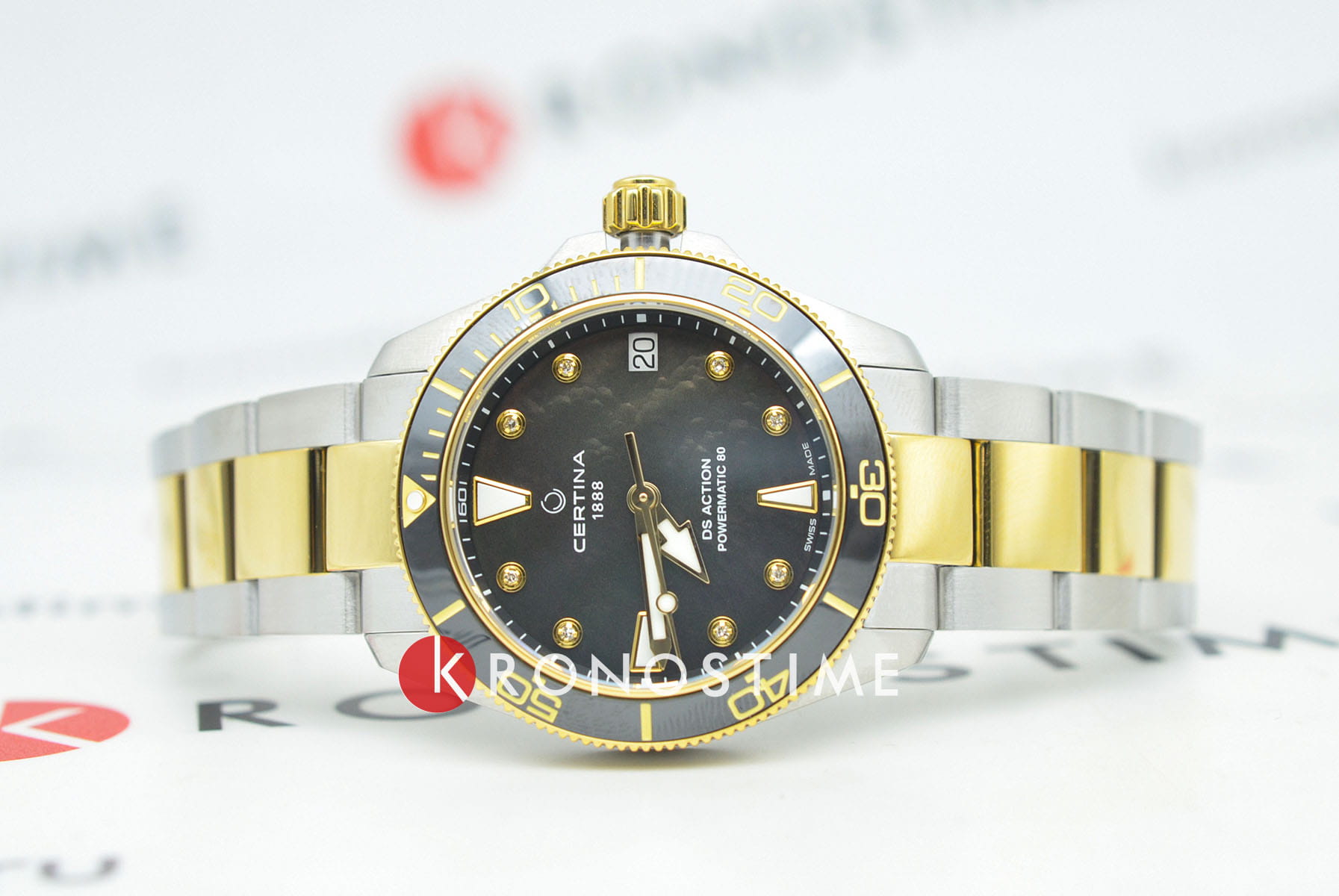 Certina DS Action Lady C032.007.22.126.00 – женские часы для поклонников ярких аксессуаров. И корпус, и браслет изготовлены из высококачественной нержавеющей стали 316L с PVD-покрытиемPVDУльтратонкое покрытие наносится в технике вакуумного напыления, сочетает в себе нитрид титана особой прочности со слоем золота или оксида хрома. Несёт в себе декоративную или защитную функцию.. Под твердым сапфировым стекломСапфировое стеклоПрочный и надёжный материал из кристалла сапфира синтетического происхождения, характеризующийся особой твёрдостью и устойчивостью к царапинам и повреждениям. с антибликовым покрытиемАнтибликовое покрытиеСлой оксида металла в 0,13-0,3 микрон, благодаря которому стекло часов не бликует и не отражает свет. Антибликовое покрытие уменьшает отражение света в 10 раз, обеспечивая отличную читаемость показателей циферблата. находится перламутрово-черный циферблат, украшенный бриллиантам и на котором вы найдете окошко даты в положении 3 часа, а также маркировку, покрытую люминесцентным покрытиемЛюминесцентное покрытиеПозволяет считывать показания времени в темноте. Производители наносят на стрелки, часовые индексы, безель или поверхность циферблата светонакопительный состав, дающий холодное свечение. Super-LumiNova. Керамический безельБезельВнешний ободок, закрепляющий стекло. В спортивных часах так называется поворотное кольцо с делениями на циферблате, выполняет роль таймера – замеряет отрезки времени на шкале. Неподвижный безель – элемент декора. Однонаправленно вращающийся безель на дайверских часах позволяет фиксировать моменты погружения и выныривания на поверхность. с черным PVD-покрытиемPVDУльтратонкое покрытие наносится в технике вакуумного напыления, сочетает в себе нитрид титана особой прочности со слоем золота или оксида хрома. Несёт в себе декоративную или защитную функцию. имеет минутную шкалу и вращается в одном направлении, что позволяет удобно измерять временные отрезки. Все это приводится в действие автоматическим механизмом Powermatic 80Powermatic 80Эксклюзивный калибр от швейцарской компании ETA с увеличенным запасом хода до 80 часов за счёт удлинённой заводной пружины. Характеризуется улучшенной системой спуска со сниженным трением..611 с пружиной Nivachron™Nivachron™Специально разработанный инновационный сплав Nivachron™ повышает устойчивость часов к воздействию магнитных полей.. Класс водозащиты: 300 метров, позволит плавать, нырять и заниматься другими водными видами спорта. Стальной браслет на застёжке-бабочке с кнопкамиЗастёжка "бабочка"Такой вид застёжки дополняется предохранителями, помогающими избежать случайного раскрытия браслета. Обладают изящным исполнением. .