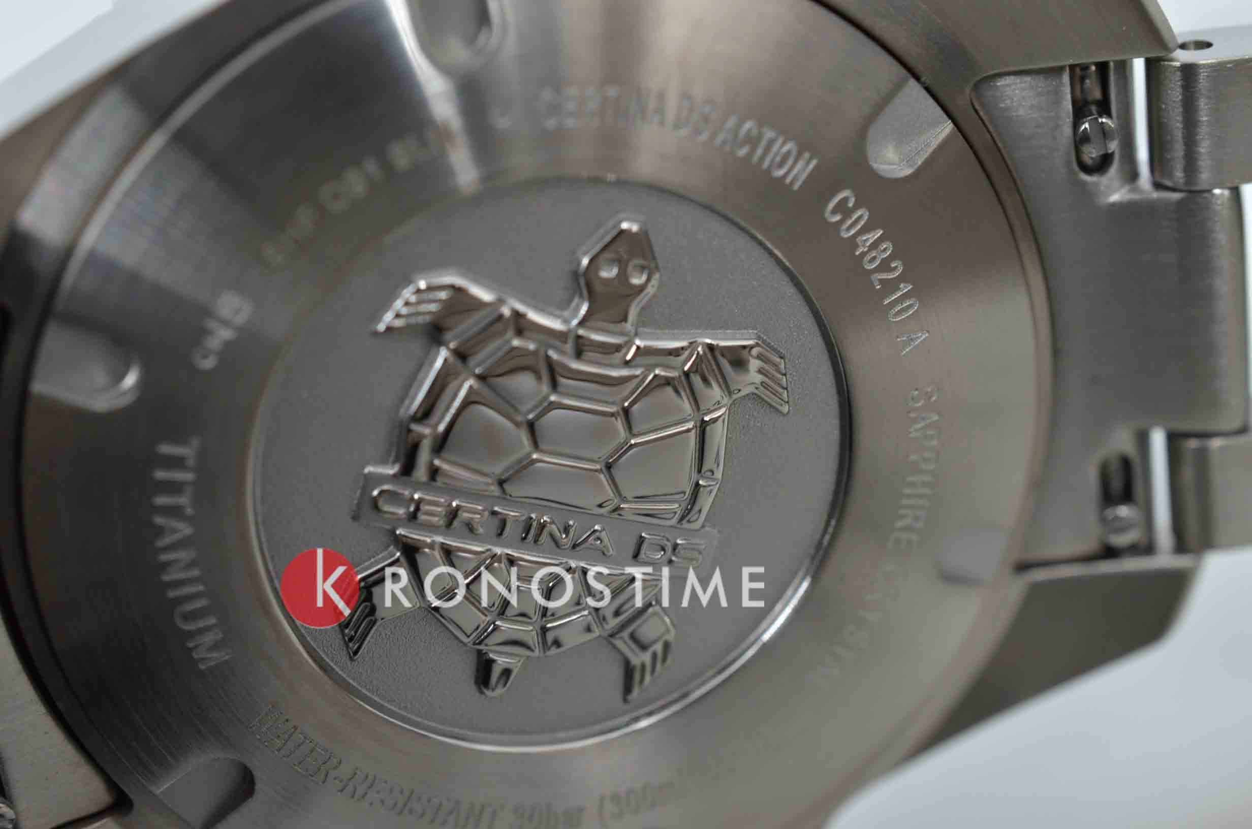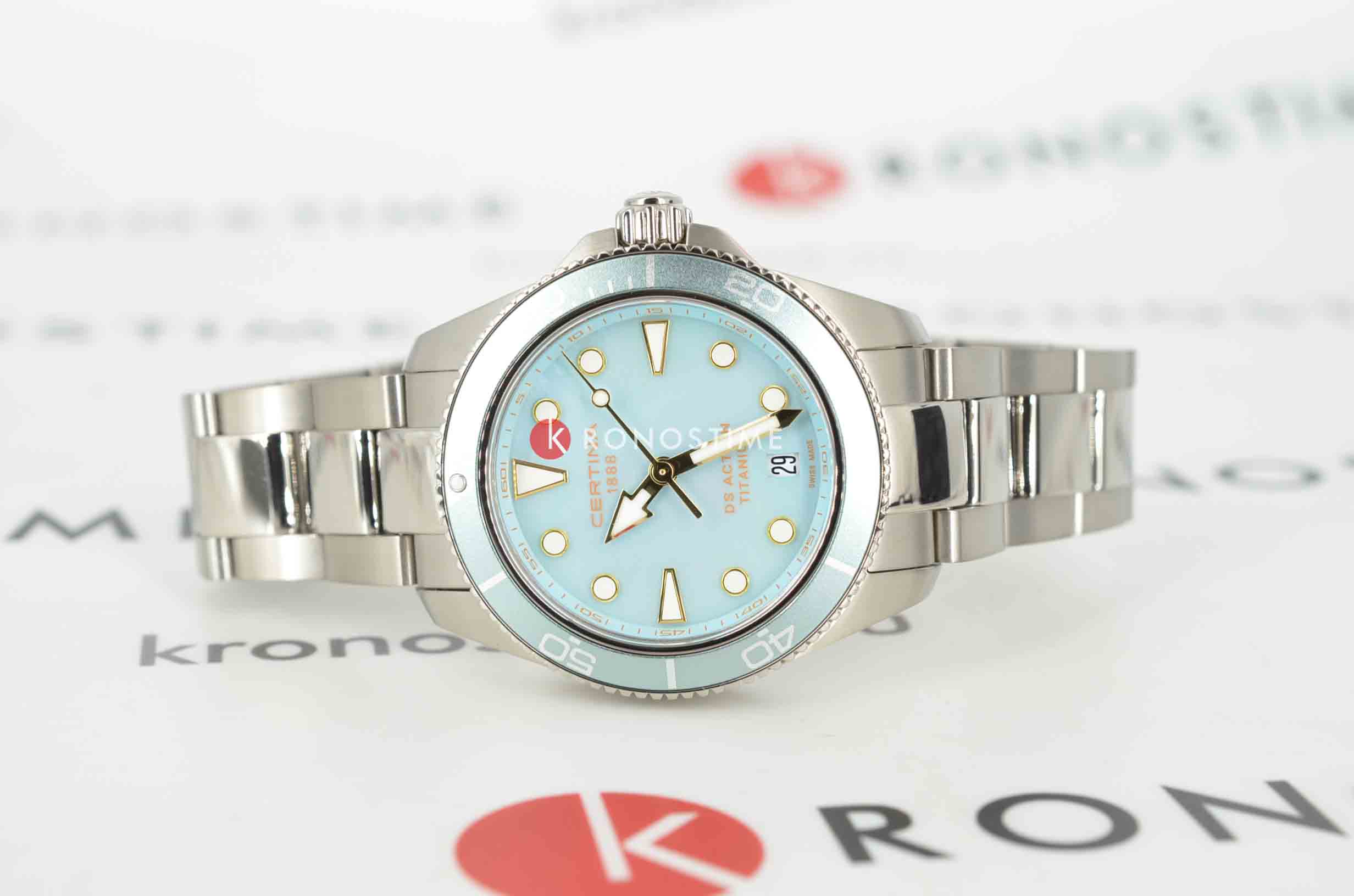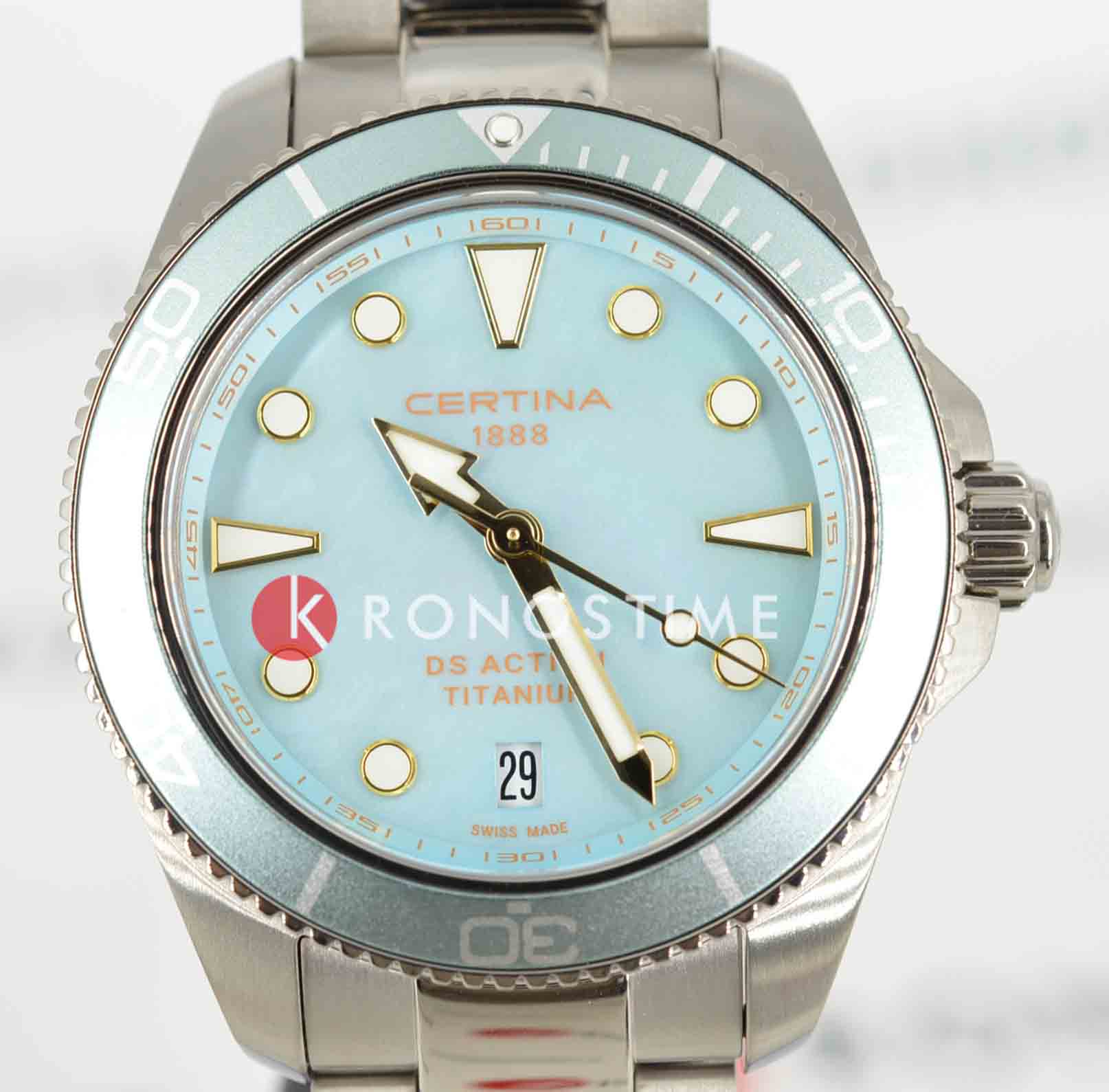 Certina DS Action Lady C048.210.44.131.00 – элегантные женские часы, сочетающие изысканный стиль и высокую функциональность. Корпус диаметром 34,5 мм выполнен из титана, что обеспечивает лёгкость, прочность и гипоаллергенные свойства. Перламутровый циферблат украшен метками с люминесцентным покрытиемЛюминесцентное покрытиеПозволяет считывать показания времени в темноте. Производители наносят на стрелки, часовые индексы, безель или поверхность циферблата светонакопительный состав, дающий холодное свечение., обеспечивающим отличную читаемость в любых условиях, и защищён сапфировым стекломСапфировое стеклоПрочный и надёжный материал из кристалла сапфира синтетического происхождения, характеризующийся особой твёрдостью и устойчивостью к царапинам и повреждениям. с антибликовым покрытиемАнтибликовое покрытиеСлой оксида металла в 0,13-0,3 микрон, благодаря которому стекло часов не бликует и не отражает свет. Антибликовое покрытие уменьшает отражение света в 10 раз, обеспечивая отличную читаемость показателей циферблата., устойчивым к царапинам. БезельБезельВнешний ободок, закрепляющий стекло. В спортивных часах так называется поворотное кольцо с делениями на циферблате, выполняет роль таймера – замеряет отрезки времени на шкале. Неподвижный безель – элемент декора. Однонаправленно вращающийся безель на дайверских часах позволяет фиксировать моменты погружения и выныривания на поверхность. с PVD-покрытиемPVDУльтратонкое покрытие наносится в технике вакуумного напыления, сочетает в себе нитрид титана особой прочности со слоем золота или оксида хрома. Несёт в себе декоративную или защитную функцию.. Часы оснащены швейцарским кварцевым механизмом ETA F05.412 с технологией Precidrive™Precidrive™Инновационный кварцевый механизм Certina. Часы, оснащённые этим швейцарским калибром, приравниваются к точности к сертифицированным хронометрам, точность хода составляет +/-10 секунд в год., обеспечивающей высокую точность хода. Функция EOLEOLПредставляет собой систему, уведомляющую владельца часов о необходимости замены элемента питания. За 2 недели до полного разряда батарейки секундная стрелка перестаёт ходить чётко и начинает перепрыгивать на 3-4 деления. (индикатор окончания заряда батареи) своевременно предупреждает о необходимости замены элемента питания. Браслет из титана оснащён системой быстрой замены, позволяющей легко менять ремешки без использования инструментов. Водонепроницаемость 300 метров (30 бар) делает эту модель идеальным выбором для плавания и дайвинга.
