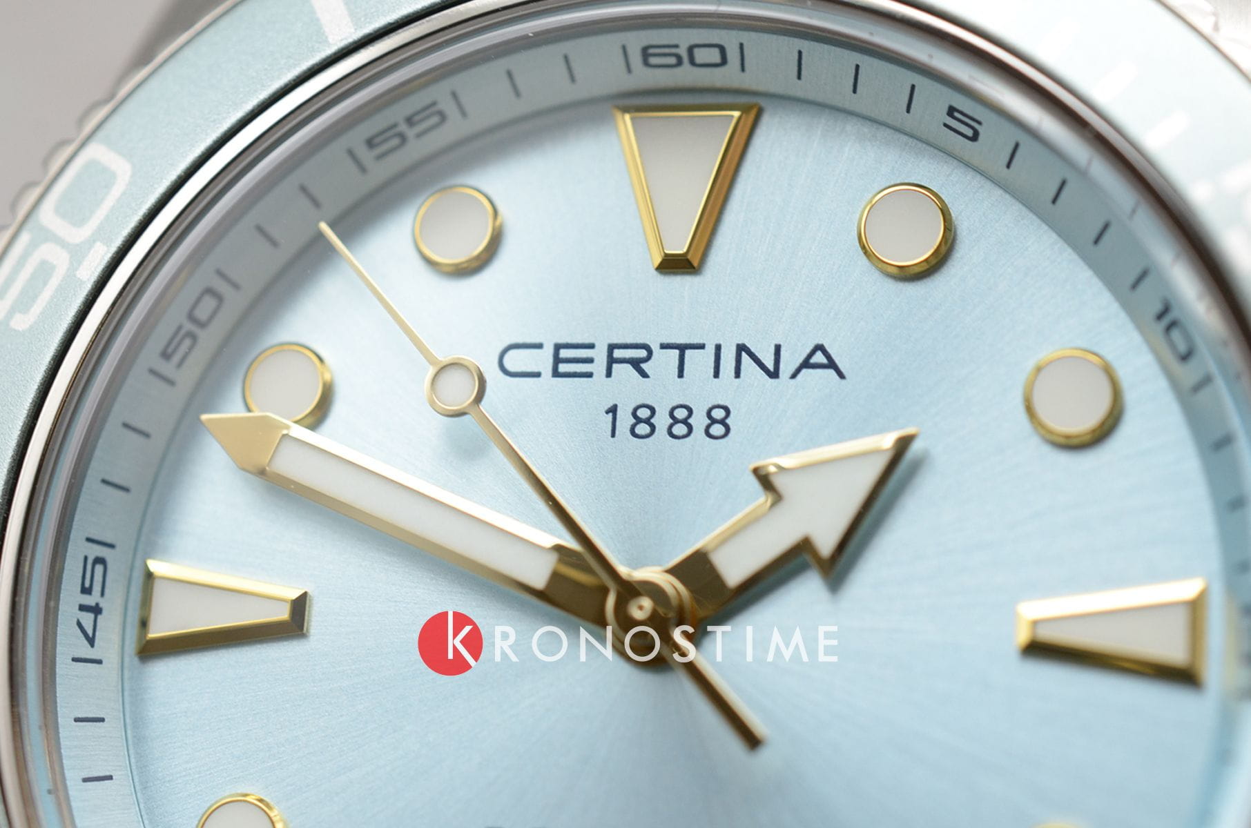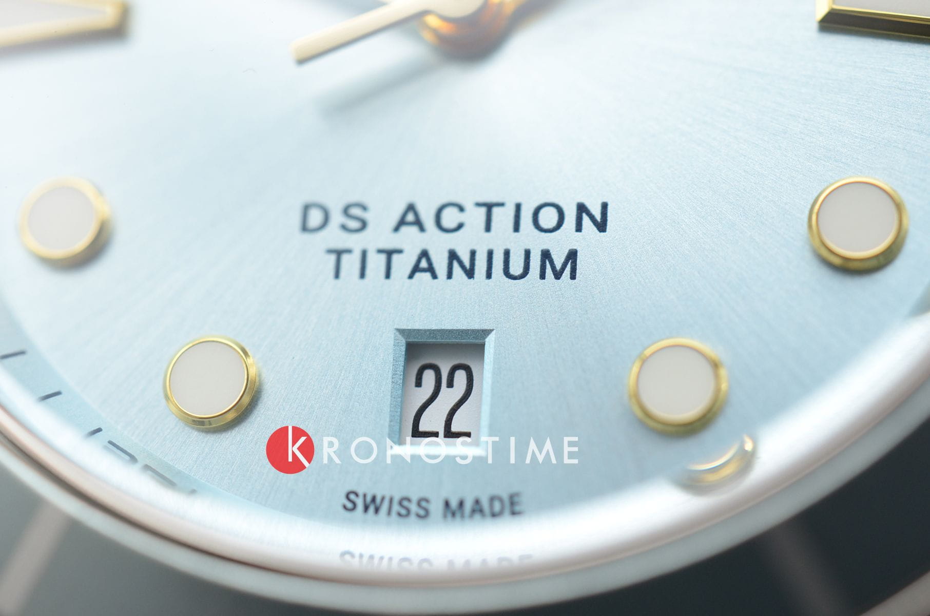 Certina DS Action C048.410.44.351.00 – элегантные мужские часы, сочетающие современный дизайн и высокую функциональность. Корпус диаметром 40 мм выполнен из титана, что обеспечивает лёгкость, прочность и гипоаллергенные свойства. Светло-голубой циферблат с метками и стрелками, покрытыми люминесцентным покрытиемЛюминесцентное покрытиеПозволяет считывать показания времени в темноте. Производители наносят на стрелки, часовые индексы, безель или поверхность циферблата светонакопительный состав, дающий холодное свечение., обеспечивает отличную читаемость в любых условиях, а его поверхность защищена сапфировым стекломСапфировое стеклоПрочный и надёжный материал из кристалла сапфира синтетического происхождения, характеризующийся особой твёрдостью и устойчивостью к царапинам и повреждениям. с антибликовым покрытиемАнтибликовое покрытиеСлой оксида металла в 0,13-0,3 микрон, благодаря которому стекло часов не бликует и не отражает свет. Антибликовое покрытие уменьшает отражение света в 10 раз, обеспечивая отличную читаемость показателей циферблата., устойчивым к царапинам.БезельБезельВнешний ободок, закрепляющий стекло. В спортивных часах так называется поворотное кольцо с делениями на циферблате, выполняет роль таймера – замеряет отрезки времени на шкале. Неподвижный безель – элемент декора. Однонаправленно вращающийся безель на дайверских часах позволяет фиксировать моменты погружения и выныривания на поверхность. с PVD-покрытиемPVDУльтратонкое покрытие наносится в технике вакуумного напыления, сочетает в себе нитрид титана особой прочности со слоем золота или оксида хрома. Несёт в себе декоративную или защитную функцию.. Часы оснащены швейцарским кварцевым механизмом ETA F06.412 с технологией Precidrive™Precidrive™Инновационный кварцевый механизм Certina. Часы, оснащённые этим швейцарским калибром, приравниваются к точности к сертифицированным хронометрам, точность хода составляет +/-10 секунд в год., обеспечивающей исключительную точность хода. Функция EOLEOLПредставляет собой систему, уведомляющую владельца часов о необходимости замены элемента питания. За 2 недели до полного разряда батарейки секундная стрелка перестаёт ходить чётко и начинает перепрыгивать на 3-4 деления. (индикатор окончания заряда батареи) предупреждает о необходимости замены элемента питания. Браслет из титана оснащён системой быстрой замены, позволяющей легко адаптировать стиль часов. Водонепроницаемость 300 метров (30 бар) делает модель идеальным выбором для плавания и дайвинга.