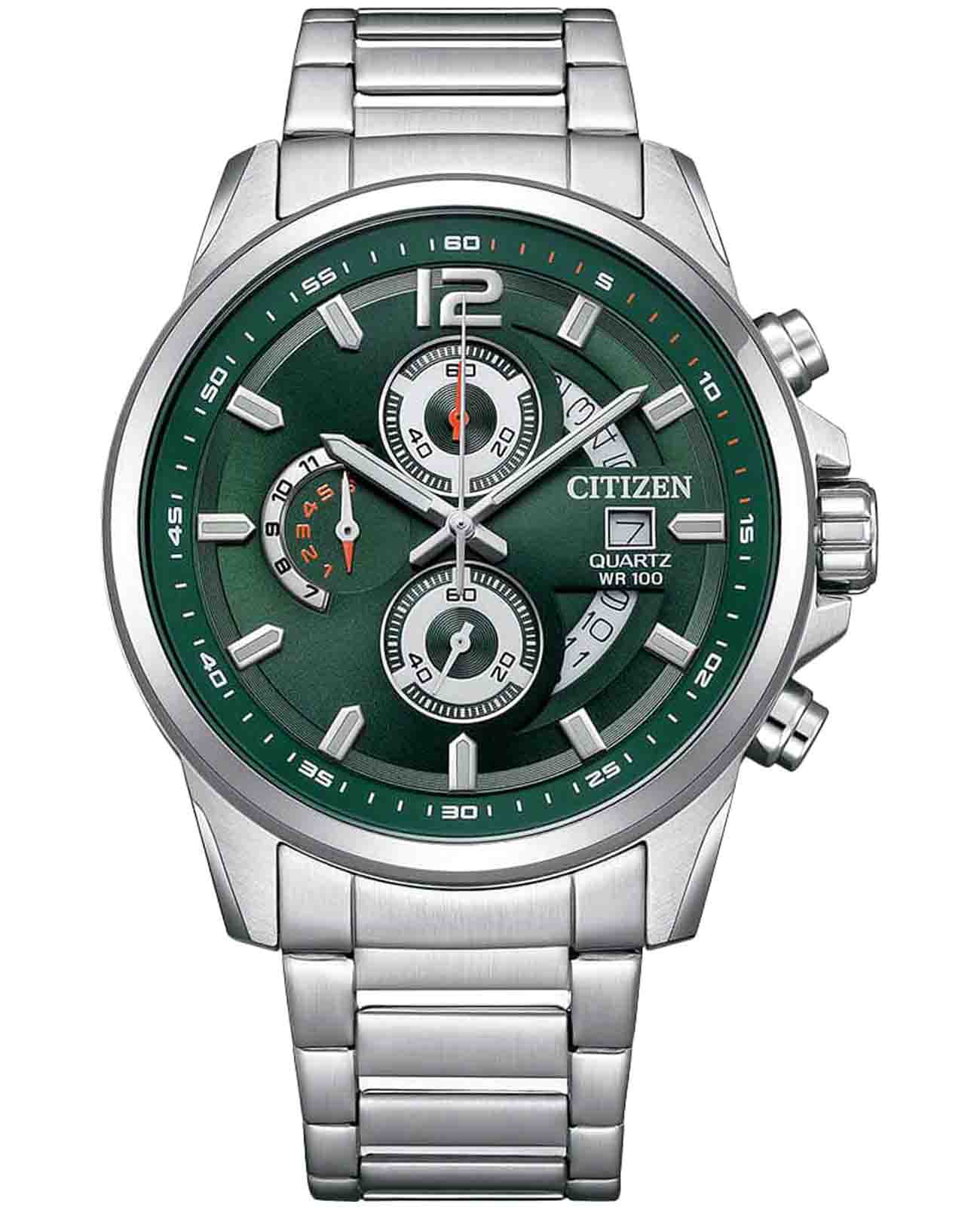 Citizen Chronograph AN3690-56X часы-хронографХронографФункция позволяет измерять отрезки времени с особой точностью: часы, минуты, секунды. Верным признаком хронографа является наличие на циферблате 3 дополнительных окошек-счётчиков. с секундомеромСекундомерСекундоме́р — прибор, способный измерять интервалы времени с точностью до долей секунды. спортивного дизайна с высоким уровнем водозащиты. Корпус из нержавеющей стали диаметром 44 мм идеально сбалансирован. Минеральное стеклоМинеральное стеклоМинеральное стекло представляет собой искусственно выращенный минерал кварца. Такое стекло отличается особой устойчивостью к повреждениям и царапинам. Уступает по некоторым качествам сапфировому стеклу. обеспечивает отличную защиту циферблата от царапин. Часы работают на основе кварцевого механизма. Стальной браслет на раскладной застёжкеРаскладная застёжкаТакой тип застёжки используется только на браслетах из металла. Она никогда не раскрывается полностью, происходит разделение на 2 и более частей. Раскладывающая застёжка снизит вероятность потери часов к минимуму. идеально дополняют дизайн часов, обеспечивая комфортное ношение. Секундомер с точностью 1с и временем измерения 12ч отображается центральной стрелкой. Циферблат с метками в виде штрихов выполнен по технологии Sunray (солнечные лучи). Окошко даты находится в положении 3 часа. Заводная головка с защитой. Часы обладают впечатляющей водонепроницаемостью до 100WR, что делает их идеальными для повседневной носки.
