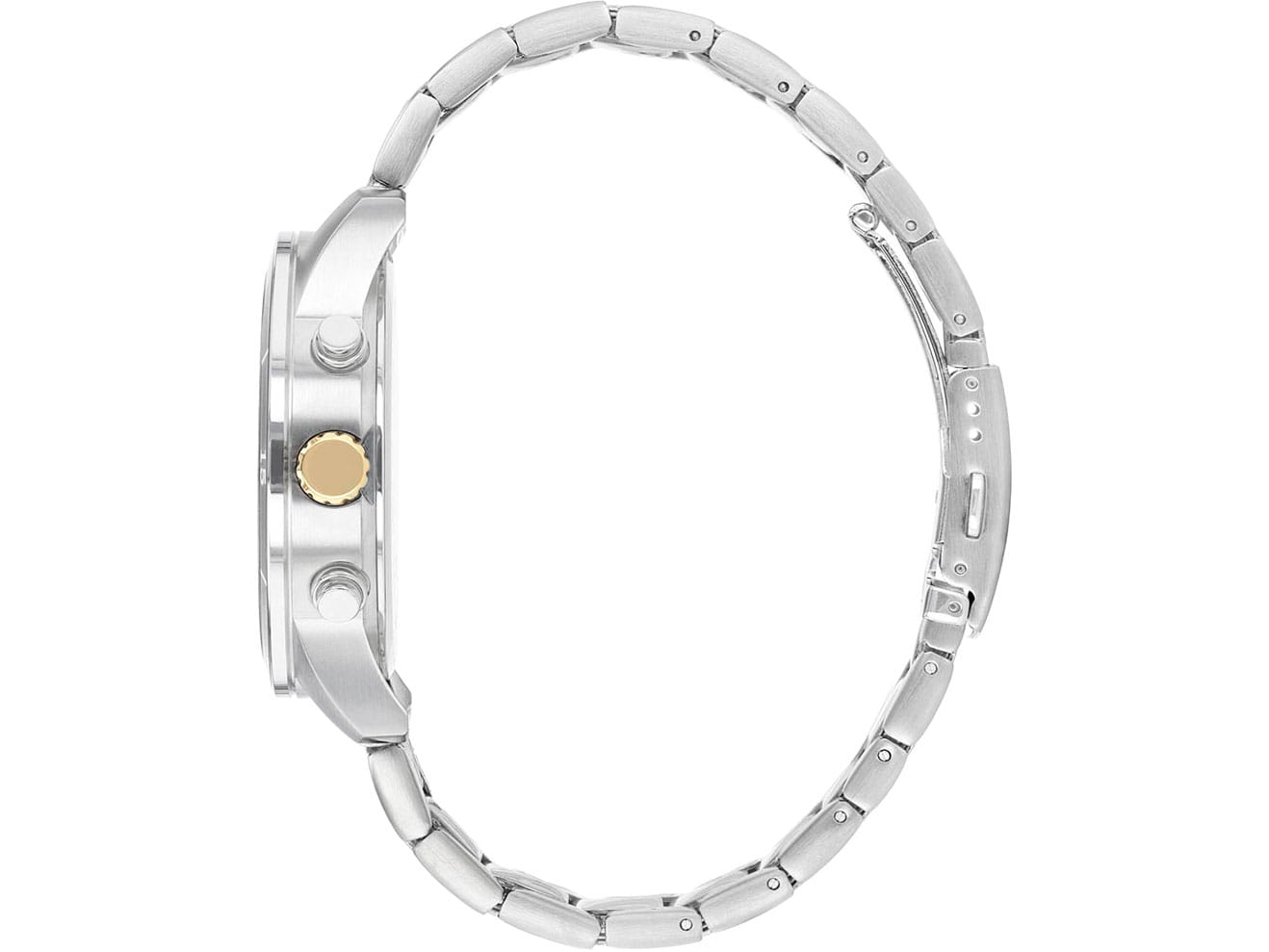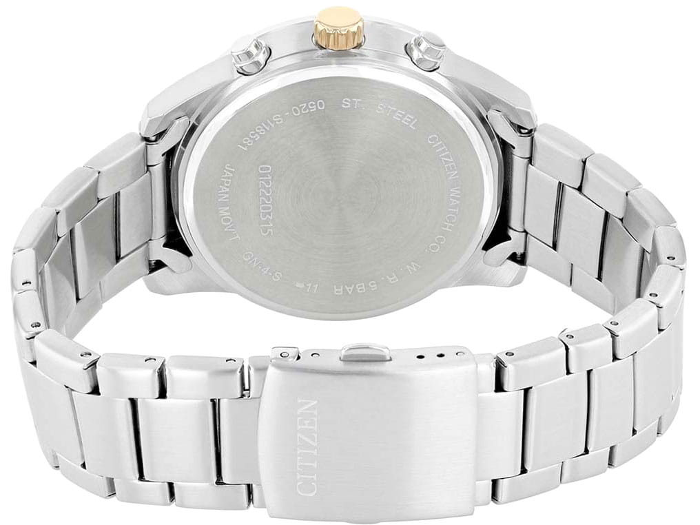 Citizen Chronograph AN8168-51H часы-хронографХронографФункция позволяет измерять отрезки времени с особой точностью: часы, минуты, секунды. Верным признаком хронографа является наличие на циферблате 3 дополнительных окошек-счётчиков. с секундомеромСекундомерСекундоме́р — прибор, способный измерять интервалы времени с точностью до долей секунды. спортивного дизайна с высоким уровнем водозащиты. Корпус из нержавеющей стали диаметром 44 мм идеально сбалансирован. Минеральное стеклоМинеральное стеклоМинеральное стекло представляет собой искусственно выращенный минерал кварца. Такое стекло отличается особой устойчивостью к повреждениям и царапинам. Уступает по некоторым качествам сапфировому стеклу. обеспечивает отличную защиту циферблата от царапин. Часы работают на основе кварцевого механизма. Стальной браслет на раскладной застёжкеРаскладная застёжкаТакой тип застёжки используется только на браслетах из металла. Она никогда не раскрывается полностью, происходит разделение на 2 и более частей. Раскладывающая застёжка снизит вероятность потери часов к минимуму. идеально дополняют дизайн часов, обеспечивая комфортное ношение. Стрелки и метки на циферблате имеют люминесцентное покрытиеЛюминесцентное покрытиеПозволяет считывать показания времени в темноте. Производители наносят на стрелки, часовые индексы, безель или поверхность циферблата светонакопительный состав, дающий холодное свечение. позволяющее легко определять время даже в темноте. БезельБезельВнешний ободок, закрепляющий стекло. В спортивных часах так называется поворотное кольцо с делениями на циферблате, выполняет роль таймера – замеряет отрезки времени на шкале. Неподвижный безель – элемент декора. Однонаправленно вращающийся безель на дайверских часах позволяет фиксировать моменты погружения и выныривания на поверхность. с IP-покрытиемIP-покрытиеМетод ионного напыления. Демонстрирует повышенную устойчивость к истиранию, окислению и химическим веществам. Под воздействием высокого давления и температуры около 1500°C молекулы металла надёжно соединяются с частицами корпуса часов. и минутной шкалой. Циферблат с метками в виде штрихов выполнен по технологии Sunray (солнечные лучи). 12-ти и 24-х часовой формат времени отображается на отдельном циферблате. Окошко даты находится между часовыми отметками 4 и 5. Заводная головка с защитой. Часы обладают впечатляющей водонепроницаемостью до 50WR, что делает их идеальными для повседневной носки.