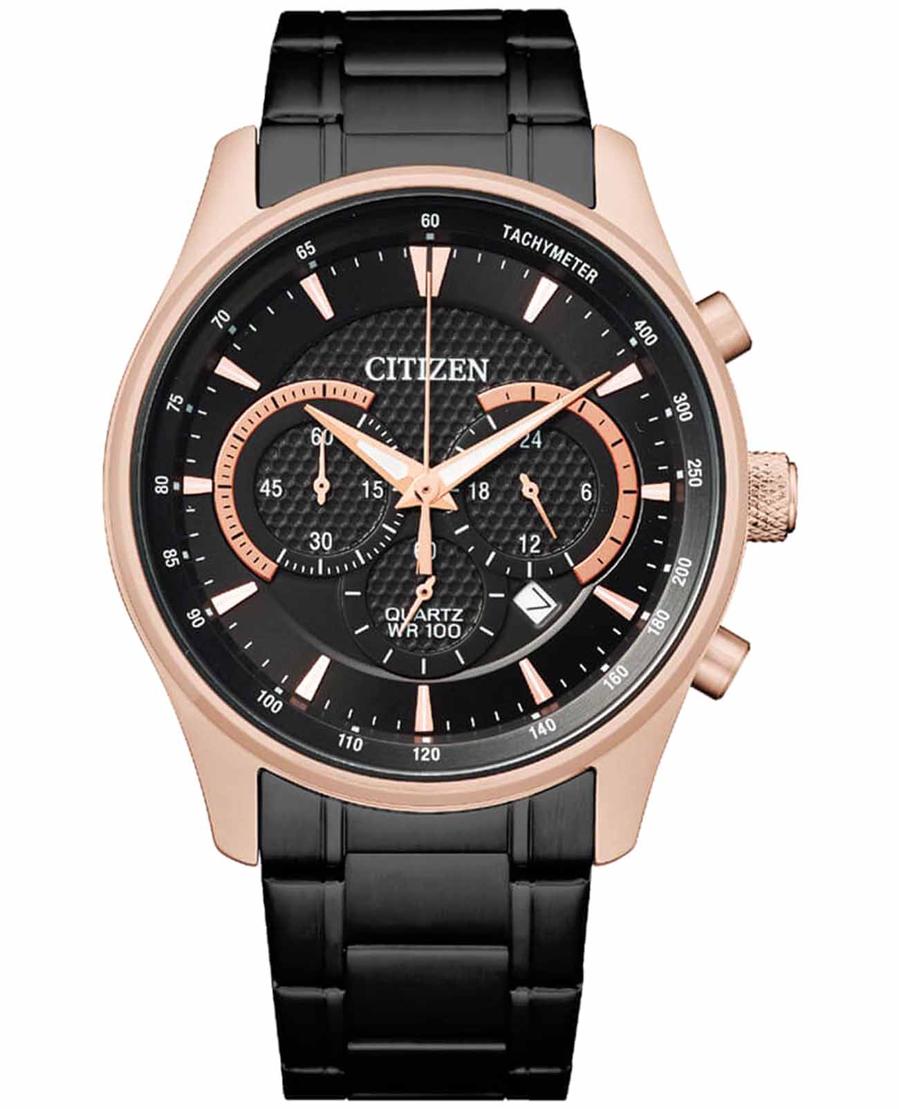 Citizen Chronograph AN8196-55E часы-хронографХронографФункция позволяет измерять отрезки времени с особой точностью: часы, минуты, секунды. Верным признаком хронографа является наличие на циферблате 3 дополнительных окошек-счётчиков. с секундомеромСекундомерСекундоме́р — прибор, способный измерять интервалы времени с точностью до долей секунды. и тахиметромТахиметрРазмеченная шкала, располагается на ободке или безеле часов. Тахиметр позволяет рассчитать скорость на определённом участке пути, расстояние измеряется в километрах или милях.. Корпус из нержавеющей стали с IP-покрытиемIP-покрытиеМетод ионного напыления. Демонстрирует повышенную устойчивость к истиранию, окислению и химическим веществам. Под воздействием высокого давления и температуры около 1500°C молекулы металла надёжно соединяются с частицами корпуса часов. диаметром 42 мм идеально сбалансирован. Минеральное стеклоМинеральное стеклоМинеральное стекло представляет собой искусственно выращенный минерал кварца. Такое стекло отличается особой устойчивостью к повреждениям и царапинам. Уступает по некоторым качествам сапфировому стеклу. обеспечивает отличную защиту циферблата от царапин. Часы работают на основе кварцевого механизма. Стальной браслет на раскладной застёжкеРаскладная застёжкаТакой тип застёжки используется только на браслетах из металла. Она никогда не раскрывается полностью, происходит разделение на 2 и более частей. Раскладывающая застёжка снизит вероятность потери часов к минимуму. идеально дополняют дизайн часов, обеспечивая комфортное ношение. Стрелки и метки на циферблате имеют люминесцентное покрытиеЛюминесцентное покрытиеПозволяет считывать показания времени в темноте. Производители наносят на стрелки, часовые индексы, безель или поверхность циферблата светонакопительный состав, дающий холодное свечение. позволяющее легко определять время даже в темноте. Циферблат украшен сотовым декоративным узором. Клиновидные стрелки в стиле Dauphine. Окошко даты находится между часовыми отметками 4 и 5. 12-ти и 24-х часовой формат времени отображается на отдельном циферблате. Часы обладают впечатляющей водонепроницаемостью до 100WR, что делает их идеальными для повседневной носки.