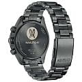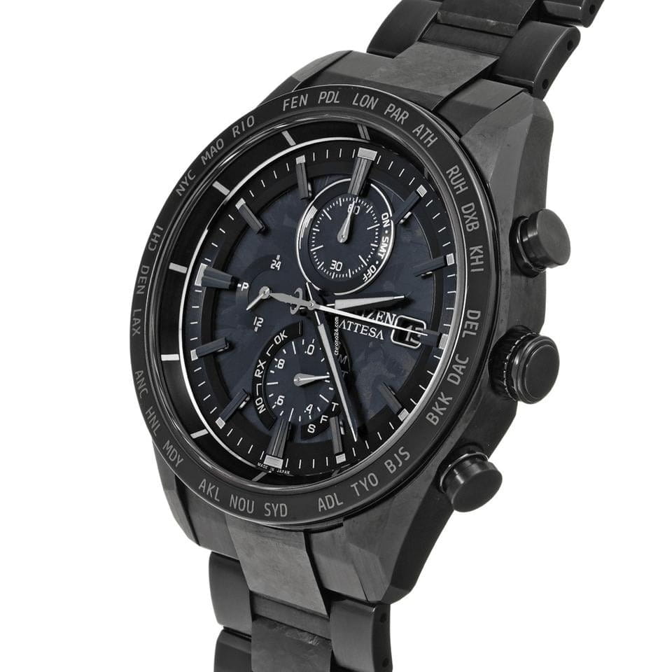 Citizen AT8287-62E — современные японские часы с кварцевым хронографомХронографФункция позволяет измерять отрезки времени с особой точностью: часы, минуты, секунды. Верным признаком хронографа является наличие на циферблате 3 дополнительных окошек-счётчиков. и секундомеромСекундомерСекундоме́р — прибор, способный измерять интервалы времени с точностью до долей секунды., выполненные в элегантном корпусе из титана с черным DLC-покрытиемDLC-покрытиеDiamond like carbon - одно из лучших видов покрытия, представляющее собой углерод с алмазными свойствами. На поверхность материала наносятся распавшиеся молекулы углерода, превращающиеся в плёнку из алмазоподобных связей, которая перенимает твёрдость алмаза. диаметром 42 мм и толщиной 11 мм. Модель оснащена инновационной технологией Eco-Drive, которая позволяет заряжать часы от солнечного света и обеспечивает запас хода до 180 дней, а при активации функции энергосбережения — до 10 месяцев без дополнительной подзарядки. Часы поддерживают автоматическую настройку времени по радиосигналу в Германии, Японии, США и Китае, а также позволяют отображать мировое времяМировое время Полезное часовое усложнение, отображающее время в основных городах и известных областях по всему миру, оно связано с часовыми поясами, удобно для путешественников и бизнесменов. для 26 городов и легко переключаться между летним и стандартным временем. Функционал включает индикацию даты и дня недели, а стрелки и часовые метки с люминесцентным покрытиемЛюминесцентное покрытиеПозволяет считывать показания времени в темноте. Производители наносят на стрелки, часовые индексы, безель или поверхность циферблата светонакопительный состав, дающий холодное свечение. обеспечивают отличную видимость в темноте. Прочное сапфировое стеклоСапфировое стеклоПрочный и надёжный материал из кристалла сапфира синтетического происхождения, характеризующийся особой твёрдостью и устойчивостью к царапинам и повреждениям. с антибликовым покрытиемАнтибликовое покрытиеСлой оксида металла в 0,13-0,3 микрон, благодаря которому стекло часов не бликует и не отражает свет. Антибликовое покрытие уменьшает отражение света в 10 раз, обеспечивая отличную читаемость показателей циферблата. устойчиво к появлению царапин и защищает лаконичный циферблат с индексами в виде штрихов. Титановый браслет с черным DLC-покрытиемDLC-покрытиеDiamond like carbon - одно из лучших видов покрытия, представляющее собой углерод с алмазными свойствами. На поверхность материала наносятся распавшиеся молекулы углерода, превращающиеся в плёнку из алмазоподобных связей, которая перенимает твёрдость алмаза. и с раскладной застёжкойРаскладная застёжкаТакой тип застёжки используется только на браслетах из металла. Она никогда не раскрывается полностью, происходит разделение на 2 и более частей. Раскладывающая застёжка снизит вероятность потери часов к минимуму. гармонично дополняет корпус, подчеркивая премиальный стиль модели. Водозащита уровня WR 100 позволяет использовать часы в повседневной жизни, в том числе во время плавания без погружения. Ограниченная серия 2900 экземпляров.
