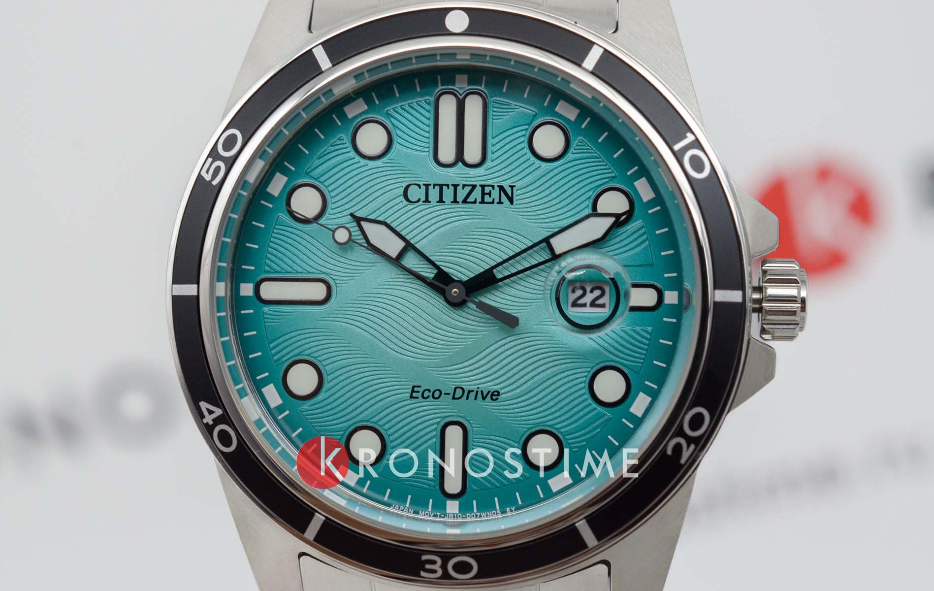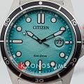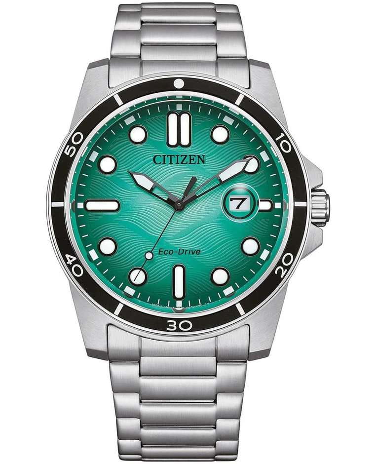 Citizen AW1816-89L — это стильные и практичные часы японского производства, которые станут отличным повседневным аксессуаром для активных мужчин. Модель оснащена современным кварцевым механизмом Citizen J810 и инновационной системой Eco-Drive, работающей на солнечной энергии, благодаря чему часы не требуют замены батарейки, а запас хода достигает 240 дней. Корпус диаметром 41,5 мм и толщиной 11,8 мм выполнен из прочной нержавеющей стали, а на безельБезельВнешний ободок, закрепляющий стекло. В спортивных часах так называется поворотное кольцо с делениями на циферблате, выполняет роль таймера – замеряет отрезки времени на шкале. Неподвижный безель – элемент декора. Однонаправленно вращающийся безель на дайверских часах позволяет фиксировать моменты погружения и выныривания на поверхность. нанесено черное IP-покрытиеIP-покрытиеМетод ионного напыления. Демонстрирует повышенную устойчивость к истиранию, окислению и химическим веществам. Под воздействием высокого давления и температуры около 1500°C молекулы металла надёжно соединяются с частицами корпуса часов., что обеспечивает надежность и долговечность. Бирюзовый циферблат украшен метками в виде точек и штрихов, а стрелки и метки с люминесцентным покрытиемЛюминесцентное покрытиеПозволяет считывать показания времени в темноте. Производители наносят на стрелки, часовые индексы, безель или поверхность циферблата светонакопительный состав, дающий холодное свечение. гарантируют отличную видимость времени даже в темноте. Окошко даты с увеличительным стеклом расположено в положении 3 часа, а заводная головка с защитой и завинчивающаяся задняя крышка повышают уровень безопасности и герметичности. Часы оснащены функцией индикации заряда EOLEOLПредставляет собой систему, уведомляющую владельца часов о необходимости замены элемента питания. За 2 недели до полного разряда батарейки секундная стрелка перестаёт ходить чётко и начинает перепрыгивать на 3-4 деления. и системой предотвращения перезарядки для дополнительного удобства. Минеральное стеклоМинеральное стеклоМинеральное стекло представляет собой искусственно выращенный минерал кварца. Такое стекло отличается особой устойчивостью к повреждениям и царапинам. Уступает по некоторым качествам сапфировому стеклу. эффективно защищает циферблат от царапин. Водозащита 100WR позволяет носить часы во время плавания и занятий водными видами спорта. Стальной браслет с раскладной застёжкойРаскладная застёжкаТакой тип застёжки используется только на браслетах из металла. Она никогда не раскрывается полностью, происходит разделение на 2 и более частей. Раскладывающая застёжка снизит вероятность потери часов к минимуму. обеспечивает комфорт и надежную фиксацию на руке, а вес модели составляет 138 грамм, что делает часы удобными для ежедневного ношения.