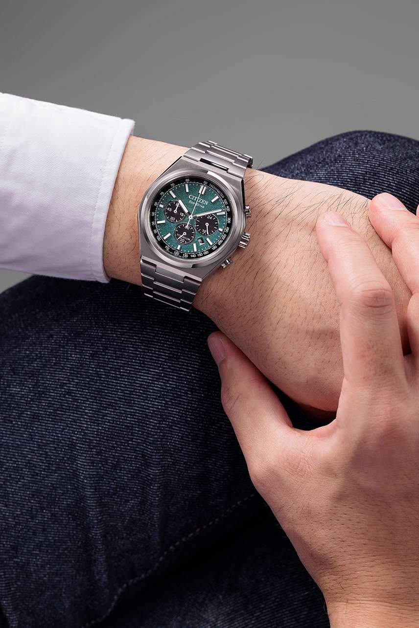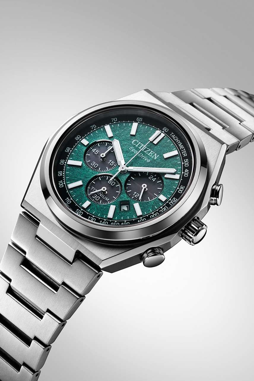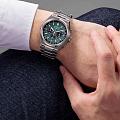 Citizen CA4610-85X — это стильные мужские кварцевые часы с функцией хронографаХронографФункция позволяет измерять отрезки времени с особой точностью: часы, минуты, секунды. Верным признаком хронографа является наличие на циферблате 3 дополнительных окошек-счётчиков., сочетающие передовые технологии и современный дизайн. Корпус и браслет выполнены из сверхлегкого и прочного титана, что обеспечивает комфортное ношение и высокую износостойкость. Зеленый круглый циферблат защищён устойчивым к царапинам сапфировым стекломСапфировое стеклоПрочный и надёжный материал из кристалла сапфира синтетического происхождения, характеризующийся особой твёрдостью и устойчивостью к царапинам и повреждениям.. Часы работают на инновационной системе Eco-Drive, питание которой осуществляется от солнечной энергии, что позволяет отказаться от замены батарейки, а запас хода достигает 9 месяцев. Стрелки с люминесцентным покрытиемЛюминесцентное покрытиеПозволяет считывать показания времени в темноте. Производители наносят на стрелки, часовые индексы, безель или поверхность циферблата светонакопительный состав, дающий холодное свечение. обеспечивают отличную читаемость времени даже в темное время суток. Для удобства предусмотрены функция предотвращения перезарядки и индикация уровня заряда EOLEOLПредставляет собой систему, уведомляющую владельца часов о необходимости замены элемента питания. За 2 недели до полного разряда батарейки секундная стрелка перестаёт ходить чётко и начинает перепрыгивать на 3-4 деления.. Надёжный японский механизм Citizen B620 обеспечивает точный ход, а центральные часовая и минутная стрелки, вынесенная на отдельный малый циферблат секундная стрелка и апертура даты между 4 и 5 часами делают использование максимально удобным. Модель поддерживает 12- и 24-часовой формат времени, а также оснащена секундомером для точного измерения промежутков. Диаметр корпуса составляет 42,5 мм, толщина — 11,6 мм, вес — около 101 грамма. Водозащита уровня WR 100 позволяет не снимать часы во время плавания без глубокого погружения. Раскладная застёжкаРаскладная застёжкаТакой тип застёжки используется только на браслетах из металла. Она никогда не раскрывается полностью, происходит разделение на 2 и более частей. Раскладывающая застёжка снизит вероятность потери часов к минимуму. на браслете обеспечивает надежную фиксацию на запястье. Модель оснащена хронографомХронографФункция позволяет измерять отрезки времени с особой точностью: часы, минуты, секунды. Верным признаком хронографа является наличие на циферблате 3 дополнительных окошек-счётчиков. с секундомеромСекундомерСекундоме́р — прибор, способный измерять интервалы времени с точностью до долей секунды. и тахиметромТахиметрРазмеченная шкала, располагается на ободке или безеле часов. Тахиметр позволяет рассчитать скорость на определённом участке пути, расстояние измеряется в километрах или милях..