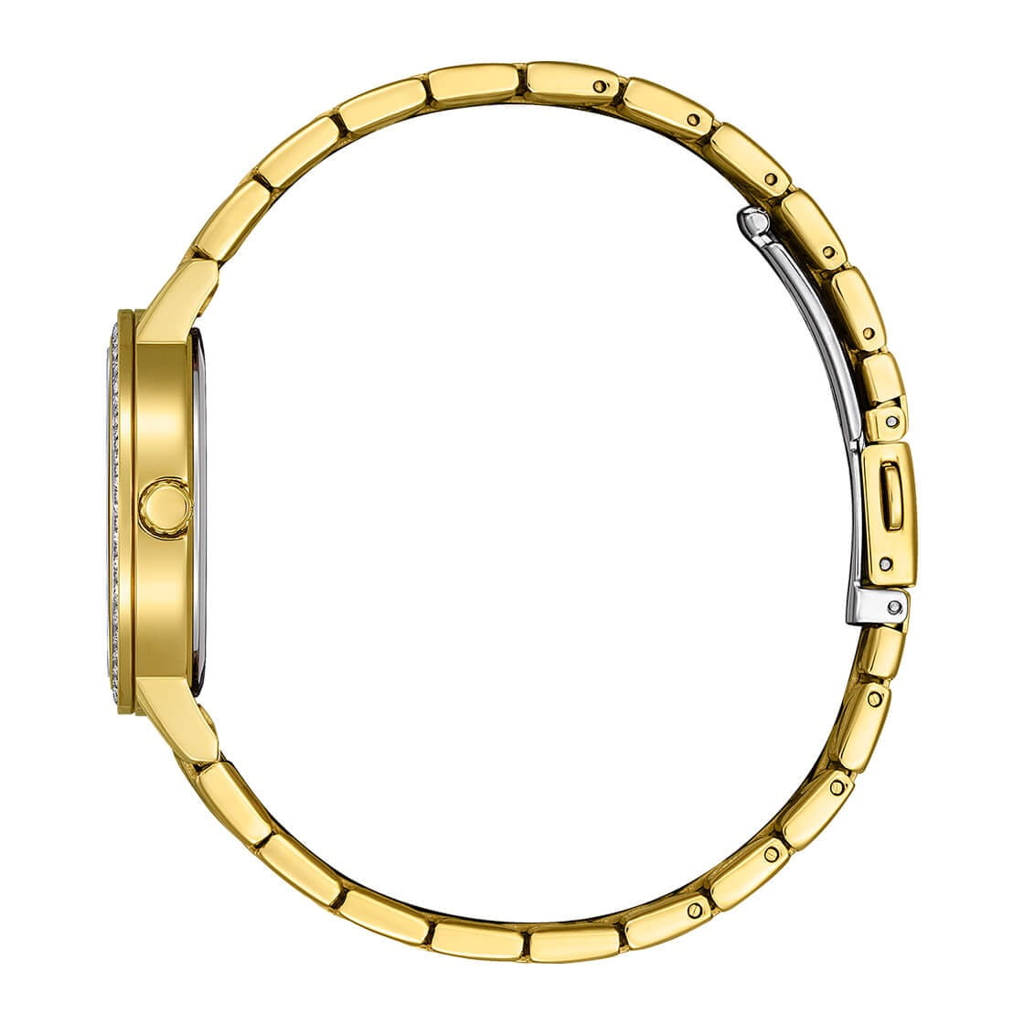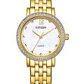 Часы Citizen EL3102-50D представляют собой элегантную модель, выполненную в Японии, сочетающую в себе современные технологии и утончённый дизайн. Корпус и браслет изготовлены из прочной нержавеющей стали с золотистым IP-покрытиемIP-покрытиеМетод ионного напыления. Демонстрирует повышенную устойчивость к истиранию, окислению и химическим веществам. Под воздействием высокого давления и температуры около 1500°C молекулы металла надёжно соединяются с частицами корпуса часов., что обеспечивает долговечность и привлекательный внешний вид. Диаметр корпуса составляет 31 мм, а толщина — всего 7 мм, что делает часы изящными и аккуратными на запястье. Особое внимание привлекает безельБезельВнешний ободок, закрепляющий стекло. В спортивных часах так называется поворотное кольцо с делениями на циферблате, выполняет роль таймера – замеряет отрезки времени на шкале. Неподвижный безель – элемент декора. Однонаправленно вращающийся безель на дайверских часах позволяет фиксировать моменты погружения и выныривания на поверхность., украшенный мерцающими кристаллами, которые придают часам особый шарм и изысканность. Надёжный кварцевый механизм гарантирует точность хода, а водозащита уровня WR 50 позволяет не снимать часы при мытье рук или во время дождя. Перламутровый циферблат украшен часовыми индексами в виде точек и цифр, а также оснащён центральными стрелками часов, минут и секунд для удобного считывания времени и кристаллами. Минеральное стеклоМинеральное стеклоМинеральное стекло представляет собой искусственно выращенный минерал кварца. Такое стекло отличается особой устойчивостью к повреждениям и царапинам. Уступает по некоторым качествам сапфировому стеклу. устойчиво к появлению мелких царапин, сохраняя прозрачность и презентабельный вид. Стальной браслет с золотистым IP-покрытиемIP-покрытиеМетод ионного напыления. Демонстрирует повышенную устойчивость к истиранию, окислению и химическим веществам. Под воздействием высокого давления и температуры около 1500°C молекулы металла надёжно соединяются с частицами корпуса часов. и раскладной застёжкойРаскладная застёжкаТакой тип застёжки используется только на браслетах из металла. Она никогда не раскрывается полностью, происходит разделение на 2 и более частей. Раскладывающая застёжка снизит вероятность потери часов к минимуму. надежно фиксирует часы на запястье, обеспечивая комфорт при ежедневном ношении.