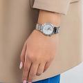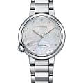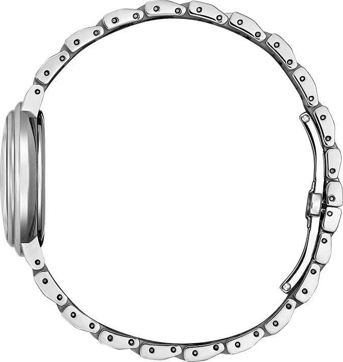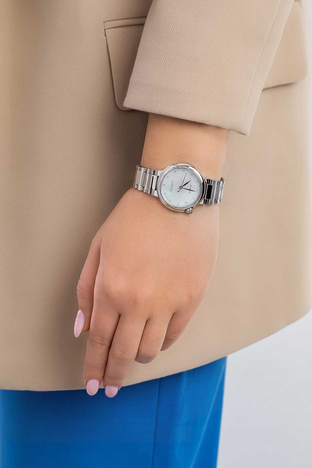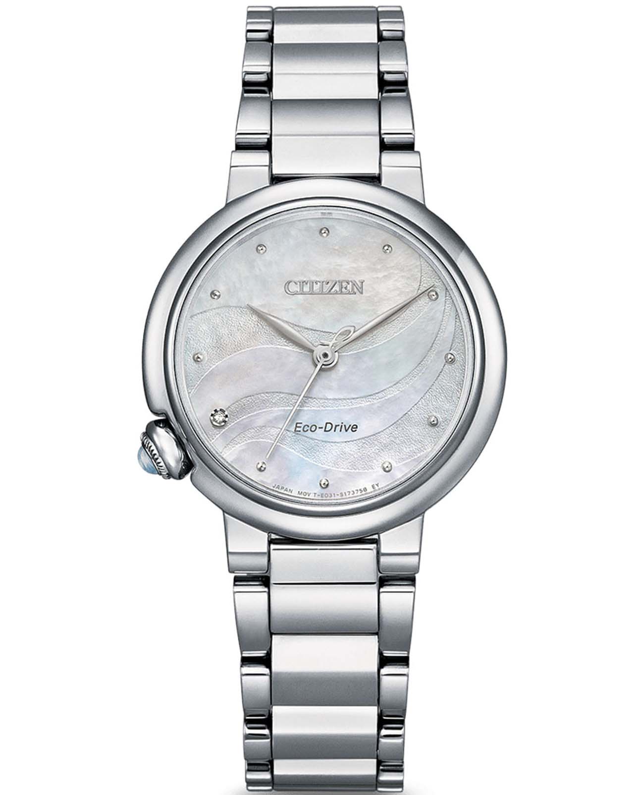 Часы Citizen EM0910-80D — воплощение изысканности и современных технологий, выполненное в Японии. Корпус и литой браслет изготовлены из прочной нержавеющей стали, что гарантирует долговечность и элегантный внешний вид. Перламутровый циферблат с завораживающими переливами украшен бриллиантом, а часовые метки выполнены в виде точек, что придаёт образу особую утонченность. Заводная головка с защитой находится в положении 8 часов и также украшена камнем. Защиту от царапин обеспечивает сапфировое стеклоСапфировое стеклоПрочный и надёжный материал из кристалла сапфира синтетического происхождения, характеризующийся особой твёрдостью и устойчивостью к царапинам и повреждениям., сохраняющее безупречный вид часов на длительное время. Модель оснащена инновационной системой Eco-Drive, работающей на солнечной энергии и не требующей замены батарейки, с запасом хода до 180 дней. Предусмотрена функция индикации уровня заряда (EOLEOLПредставляет собой систему, уведомляющую владельца часов о необходимости замены элемента питания. За 2 недели до полного разряда батарейки секундная стрелка перестаёт ходить чётко и начинает перепрыгивать на 3-4 деления.) и предотвращения перезарядки. Диаметр корпуса составляет 30 мм, толщина — 8,5 мм, вес — 74 г, что обеспечивает комфортное ношение в течение всего дня. Водозащита уровня 50WR позволяет не снимать часы при мытье рук или в дождливую погоду. Браслет с застежкой «бабочка»Застёжка "бабочка"Такой вид застёжки дополняется предохранителями, помогающими избежать случайного раскрытия браслета. Обладают изящным исполнением. обеспечивает дополнительный комфорт и безопасность при носке.  Эта модель станет не только стильным аксессуаром, но и символом безупречного вкуса и внимания к деталям.