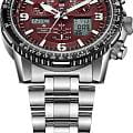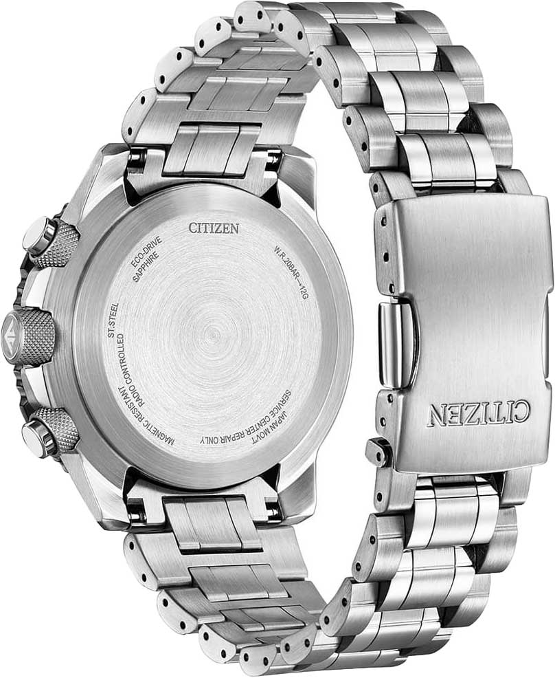 Citizen Promaster JY8086-89X часы-хронографХронографФункция позволяет измерять отрезки времени с особой точностью: часы, минуты, секунды. Верным признаком хронографа является наличие на циферблате 3 дополнительных окошек-счётчиков. с секундомеромСекундомерСекундоме́р — прибор, способный измерять интервалы времени с точностью до долей секунды. спортивного дизайна с высоким уровнем водозащиты. Корпус из нержавеющей стали диаметром 45,4 мм идеально сбалансирован. Сапфировое стеклоСапфировое стеклоПрочный и надёжный материал из кристалла сапфира синтетического происхождения, характеризующийся особой твёрдостью и устойчивостью к царапинам и повреждениям. с антибликовым покрытием обеспечивает отличную защиту циферблата от царапин. Часы работают на основе кварцевого механизма, питание от солнечной энергии. Стальной браслет на раскладной застёжкеРаскладная застёжкаТакой тип застёжки используется только на браслетах из металла. Она никогда не раскрывается полностью, происходит разделение на 2 и более частей. Раскладывающая застёжка снизит вероятность потери часов к минимуму. идеально дополняют дизайн часов, обеспечивая комфортное ношение. Стрелки и метки на циферблате имеют люминесцентное покрытиеЛюминесцентное покрытиеПозволяет считывать показания времени в темноте. Производители наносят на стрелки, часовые индексы, безель или поверхность циферблата светонакопительный состав, дающий холодное свечение. позволяющее легко определять время даже в темноте. Поворотный безельБезельВнешний ободок, закрепляющий стекло. В спортивных часах так называется поворотное кольцо с делениями на циферблате, выполняет роль таймера – замеряет отрезки времени на шкале. Неподвижный безель – элемент декора. Однонаправленно вращающийся безель на дайверских часах позволяет фиксировать моменты погружения и выныривания на поверхность. с IP-покрытиемIP-покрытиеМетод ионного напыления. Демонстрирует повышенную устойчивость к истиранию, окислению и химическим веществам. Под воздействием высокого давления и температуры около 1500°C молекулы металла надёжно соединяются с частицами корпуса часов.. Автоматический прием сигналов от радиовышек, расположенных в различных точках земного шара, которые передают временные сигналы от определенных атомных часов. Коррекция текущего времени радиосигналом на территории почти всей Европы, США, Японии и Китая. Функция индикации заряда (EOL) и предотвращения перезарядки. Мировое времяМировое время Полезное часовое усложнение, отображающее время в основных городах и известных областях по всему миру, оно связано с часовыми поясами, удобно для путешественников и бизнесменов. - 43 города (29 часовых поясов), переход на зимнее и летнее время. Всемирное координированное время UTCUTCВсемирное кординационное время, не имеющее привязки к географическому положению Гринвича, основывается на атомном отсчёте времени. Регулировка времени осуществляется более точно, чем устаревшее GMT.