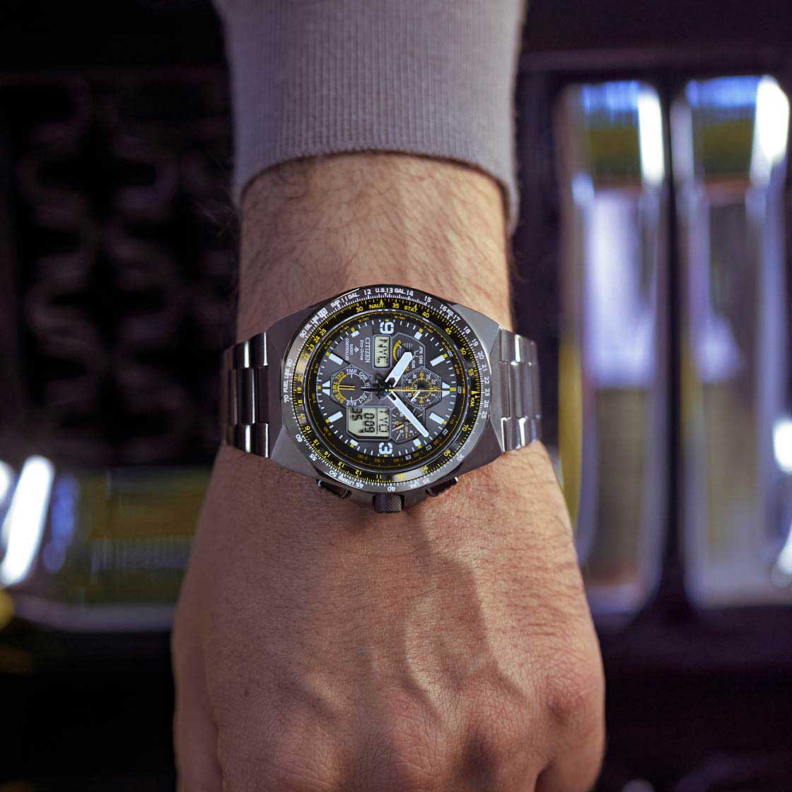Citizen Promaster JY8127-59E часы-хронографХронографФункция позволяет измерять отрезки времени с особой точностью: часы, минуты, секунды. Верным признаком хронографа является наличие на циферблате 3 дополнительных окошек-счётчиков. с секундомеромСекундомерСекундоме́р — прибор, способный измерять интервалы времени с точностью до долей секунды. спортивного дизайна с высоким уровнем водозащиты. Корпус из нержавеющей стали с IP-покрытиемIP-покрытиеМетод ионного напыления. Демонстрирует повышенную устойчивость к истиранию, окислению и химическим веществам. Под воздействием высокого давления и температуры около 1500°C молекулы металла надёжно соединяются с частицами корпуса часов. диаметром 45,7 мм идеально сбалансирован. Сапфировое стеклоСапфировое стеклоПрочный и надёжный материал из кристалла сапфира синтетического происхождения, характеризующийся особой твёрдостью и устойчивостью к царапинам и повреждениям. с антибликовым покрытием обеспечивает отличную защиту циферблата от царапин. Часы работают на основе кварцевого механизма, питание от солнечной энергии. Стальной браслет на раскладной застёжкеРаскладная застёжкаТакой тип застёжки используется только на браслетах из металла. Она никогда не раскрывается полностью, происходит разделение на 2 и более частей. Раскладывающая застёжка снизит вероятность потери часов к минимуму. идеально дополняют дизайн часов, обеспечивая комфортное ношение. Стрелки и метки на циферблате имеют люминесцентное покрытиеЛюминесцентное покрытиеПозволяет считывать показания времени в темноте. Производители наносят на стрелки, часовые индексы, безель или поверхность циферблата светонакопительный состав, дающий холодное свечение. позволяющее легко определять время даже в темноте. Поворотный безельБезельВнешний ободок, закрепляющий стекло. В спортивных часах так называется поворотное кольцо с делениями на циферблате, выполняет роль таймера – замеряет отрезки времени на шкале. Неподвижный безель – элемент декора. Однонаправленно вращающийся безель на дайверских часах позволяет фиксировать моменты погружения и выныривания на поверхность.. Автоматический прием сигналов от радиовышек, расположенных в различных точках земного шара, которые передают временные сигналы от определенных атомных часов. Коррекция текущего времени радиосигналом на территории почти всей Европы, США, Японии и Китая. Функция индикации заряда (EOL) и предотвращения перезарядки. Мировое времяМировое время Полезное часовое усложнение, отображающее время в основных городах и известных областях по всему миру, оно связано с часовыми поясами, удобно для путешественников и бизнесменов. - 43 города, переход на зимнее и летнее время. Всемирное координированное время UTCUTCВсемирное кординационное время, не имеющее привязки к географическому положению Гринвича, основывается на атомном отсчёте времени. Регулировка времени осуществляется более точно, чем устаревшее GMT.