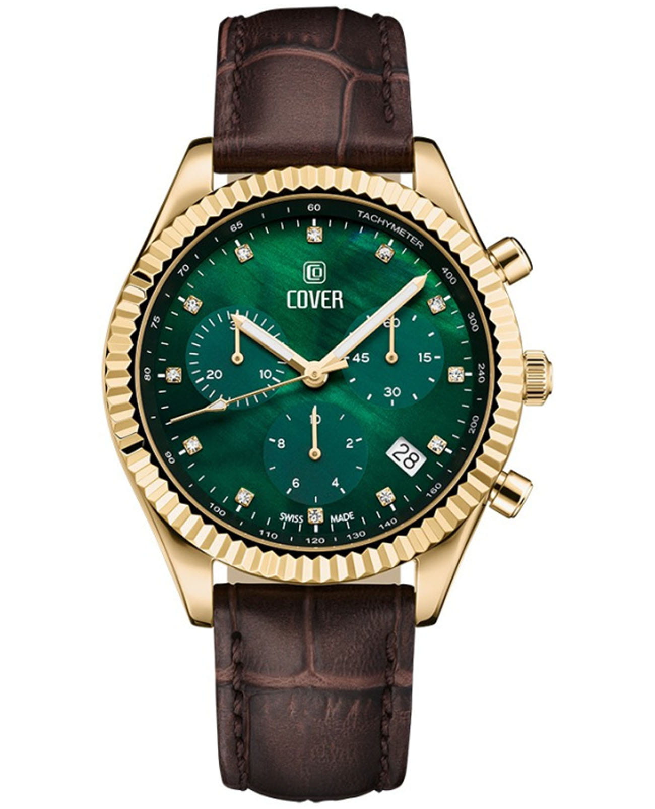 Элегантные женские часы Cover CO207.08 в спортивном стиле из коллекции Valentina Chronograph — это идеальное сочетание утонченности и функциональности. Оснащенные кварцевым механизмом с модулем хронографа Ronda 5040.D, они обеспечивают точность и надежность в каждом моменте. Зеленый перламутровый циферблат с 12 кристаллами Swarovski в роли часовых индексов придает часам изысканный вид, а три накопителя на «3», «6» и «9 часах» вместе с апертурой даты между «4» и «5 часами» добавляют функциональности. ТахиметрТахиметрРазмеченная шкала, располагается на ободке или безеле часов. Тахиметр позволяет рассчитать скорость на определённом участке пути, расстояние измеряется в километрах или милях.ическая шкала на внутреннем фланце позволяет легко отслеживать скорость, что делает эти часы не только стильными, но и практичными. Корпус диаметром 38 мм с рифленым ,безелемБезельВнешний ободок, закрепляющий стекло. В спортивных часах так называется поворотное кольцо с делениями на циферблате, выполняет роль таймера – замеряет отрезки времени на шкале. Неподвижный безель – элемент декора. Однонаправленно вращающийся безель на дайверских часах позволяет фиксировать моменты погружения и выныривания на поверхность. из нержавеющей стали с PVD-покрытиемPVDУльтратонкое покрытие наносится в технике вакуумного напыления, сочетает в себе нитрид титана особой прочности со слоем золота или оксида хрома. Несёт в себе декоративную или защитную функцию. и кожаный ремешок  подчеркивают современный дизайн и комфорт при ношении. С водонепроницаемостью до 50 м и сапфировым стекломСапфировое стеклоПрочный и надёжный материал из кристалла сапфира синтетического происхождения, характеризующийся особой твёрдостью и устойчивостью к царапинам и повреждениям., эти часы идеально подходят для активных женщин. Маркировка «Swiss Made» гарантирует высокое качество и долговечность. Гарантия на изделие составляет 2 года, что подтверждает надежность и уверенность в вашем выборе. Эти часы станут не только прекрасным дополнением к вашему образу, но и верным спутником в повседневной жизни. Кожаный ремешок на классической застежке.