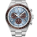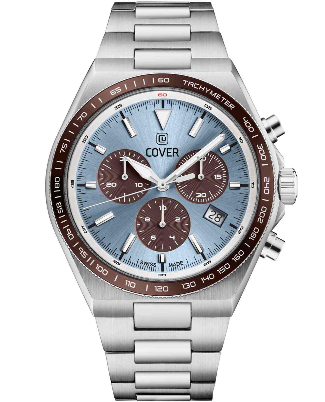 Мужские наручные часы-хронографХронографФункция позволяет измерять отрезки времени с особой точностью: часы, минуты, секунды. Верным признаком хронографа является наличие на циферблате 3 дополнительных окошек-счётчиков. Cover CO212.07 из коллекции Iconosteel сочетают в себе классический дизайн и надежность современных технологий. Часы оснащены кварцевым механизмом с модулем хронографа Ronda 5040.D, они обеспечивают точность и надежность в каждом моменте. Модель обладает круглым корпусом диаметром 41 мм, изготовленным из нержавеющей стали, что обеспечивает высокую устойчивость к внешним воздействиям. Браслет выполнен из нержавеющей стали с раскладной застёжкойРаскладная застёжкаТакой тип застёжки используется только на браслетах из металла. Она никогда не раскрывается полностью, происходит разделение на 2 и более частей. Раскладывающая застёжка снизит вероятность потери часов к минимуму., гарантирующей комфортное ношение и безопасность. Голубой циферблат оснащен окном даты на «4 часах» и стрелками с люминесцентным покрытиемЛюминесцентное покрытиеПозволяет считывать показания времени в темноте. Производители наносят на стрелки, часовые индексы, безель или поверхность циферблата светонакопительный состав, дающий холодное свечение.. Для защиты используется сапфировое стеклоСапфировое стеклоПрочный и надёжный материал из кристалла сапфира синтетического происхождения, характеризующийся особой твёрдостью и устойчивостью к царапинам и повреждениям., обеспечивающее прочную защиту от царапин и антибликовый эффект. На коричневый безельБезельВнешний ободок, закрепляющий стекло. В спортивных часах так называется поворотное кольцо с делениями на циферблате, выполняет роль таймера – замеряет отрезки времени на шкале. Неподвижный безель – элемент декора. Однонаправленно вращающийся безель на дайверских часах позволяет фиксировать моменты погружения и выныривания на поверхность. с PVD-покрытиемPVDУльтратонкое покрытие наносится в технике вакуумного напыления, сочетает в себе нитрид титана особой прочности со слоем золота или оксида хрома. Несёт в себе декоративную или защитную функцию. нанесена шкала тахиметраТахиметрРазмеченная шкала, располагается на ободке или безеле часов. Тахиметр позволяет рассчитать скорость на определённом участке пути, расстояние измеряется в километрах или милях.. Модель также является хронографом, оснащенным функцией секундомераСекундомерСекундоме́р — прибор, способный измерять интервалы времени с точностью до долей секунды., делая ее идеальной для активного образа жизни. Водонепроницаемость часов достигает 10 атмосфер (100 метров), что позволяет использовать их во время плавания и других водных видов спорта, однако не рекомендуется для глубоководного дайвинга.