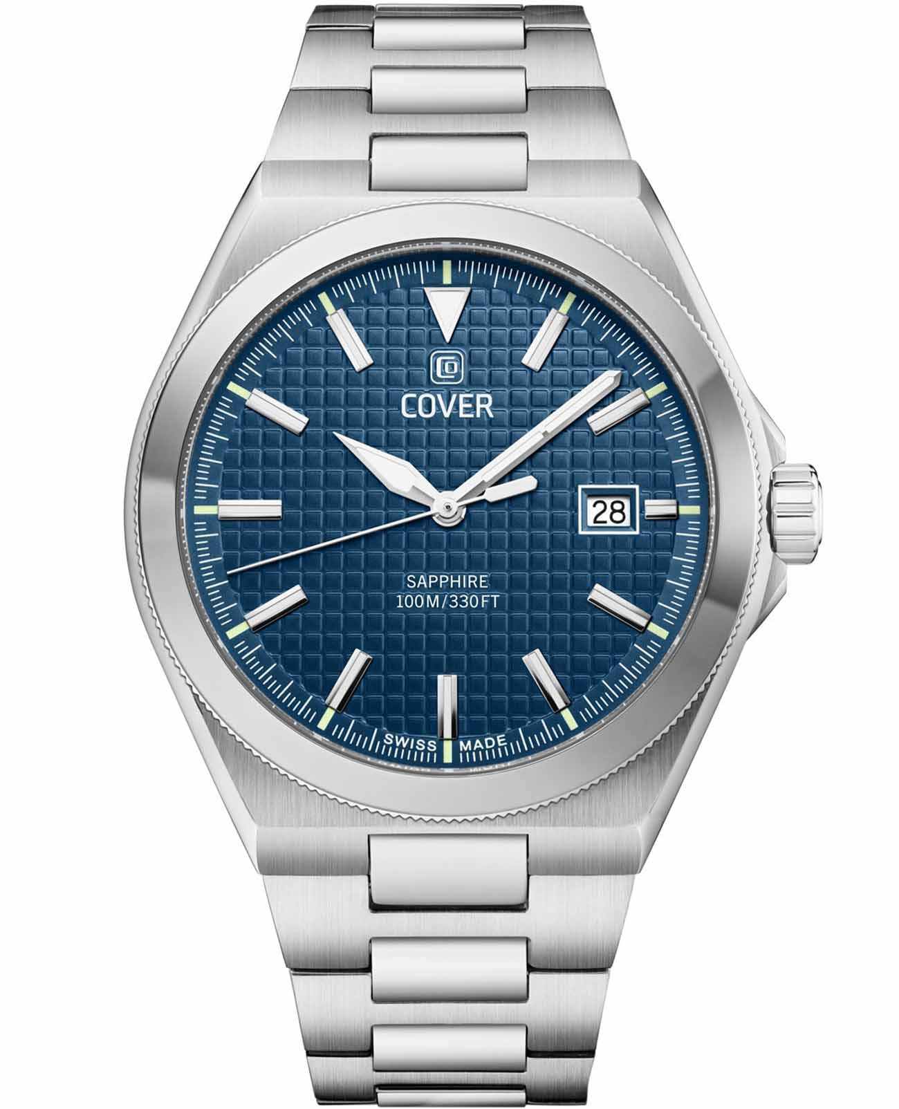 Cover CO213.07 – элегантные мужские часы, сочетающие классический дизайн и современные технологии. Корпус диаметром 41 мм выполнен из нержавеющей стали 316L, что обеспечивает прочность и долговечность. Синий циферблат с геометрическим узором с чёткими часовыми метками и стрелками, покрытыми люминесцентным покрытиемЛюминесцентное покрытиеПозволяет считывать показания времени в темноте. Производители наносят на стрелки, часовые индексы, безель или поверхность циферблата светонакопительный состав, дающий холодное свечение., гарантирует отличную читаемость в любых условиях и придает свежий и современный вид, а его поверхность защищена сапфировым стекломСапфировое стеклоПрочный и надёжный материал из кристалла сапфира синтетического происхождения, характеризующийся особой твёрдостью и устойчивостью к царапинам и повреждениям., устойчивым к царапинам. Часы оснащены швейцарским кварцевым механизмом, обеспечивающим точный ход и надёжность. Браслет из нержавеющей стали оснащён раскладной застёжкойРаскладная застёжкаТакой тип застёжки используется только на браслетах из металла. Она никогда не раскрывается полностью, происходит разделение на 2 и более частей. Раскладывающая застёжка снизит вероятность потери часов к минимуму., обеспечивающей удобную и надёжную фиксацию на запястье. Водонепроницаемость до 100 метров, позволит плавать, нырять и заниматься другими водными видами спорта.