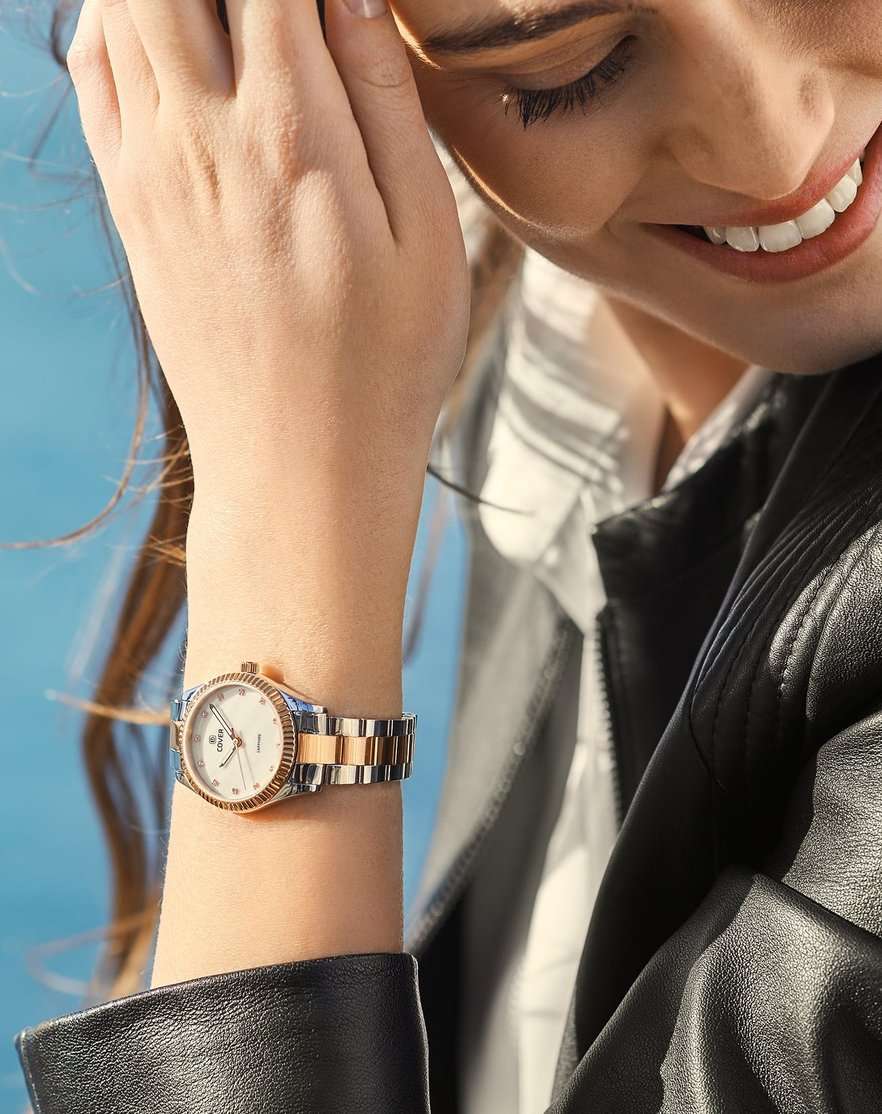 Часы Cover Valentina Mini CO224.04 воплощают в себе вечную элегантность благодаря своему чистому и утонченному дизайну. Корпус этих швейцарские часы изготовлен из полированной нержавеющей стали, а на браслет частично нанесено розово-золотистое PVD-покрытиеPVDУльтратонкое покрытие наносится в технике вакуумного напыления, сочетает в себе нитрид титана особой прочности со слоем золота или оксида хрома. Несёт в себе декоративную или защитную функцию.. Они выделяются светящимся белым циферблатом из перламутра. Золотистый рифленый безельБезельВнешний ободок, закрепляющий стекло. В спортивных часах так называется поворотное кольцо с делениями на циферблате, выполняет роль таймера – замеряет отрезки времени на шкале. Неподвижный безель – элемент декора. Однонаправленно вращающийся безель на дайверских часах позволяет фиксировать моменты погружения и выныривания на поверхность. с PVD-покрытиемPVDУльтратонкое покрытие наносится в технике вакуумного напыления, сочетает в себе нитрид титана особой прочности со слоем золота или оксида хрома. Несёт в себе декоративную или защитную функцию. цвета розового золота и ослепительные хрустальные часовые метки создают непринужденно элегантный вид а светящиеся стрелки благодаря люминесцентному покрытиюЛюминесцентное покрытиеПозволяет считывать показания времени в темноте. Производители наносят на стрелки, часовые индексы, безель или поверхность циферблата светонакопительный состав, дающий холодное свечение. обеспечивают отличную читаемость и практичность. Эти швейцарские женские часы, идеально подходящие как для делового стиля, так и для повседневного образа, воплощают в себе универсальность и утонченность. Оснащенные устойчивым к царапинам сапфировым стекломСапфировое стеклоПрочный и надёжный материал из кристалла сапфира синтетического происхождения, характеризующийся особой твёрдостью и устойчивостью к царапинам и повреждениям., швейцарским кварцевым механизмом, эти часы соединяют надежность и элегантность. Завершает образ стальной браслет с раскладной застёжкойРаскладная застёжкаТакой тип застёжки используется только на браслетах из металла. Она никогда не раскрывается полностью, происходит разделение на 2 и более частей. Раскладывающая застёжка снизит вероятность потери часов к минимуму., который удобно сидит на запястье и обеспечивает надежную фиксацию. Часы обладают водозащитой уровня 50WR, что делает их подходящими для повседневного использования и активного образа жизни.