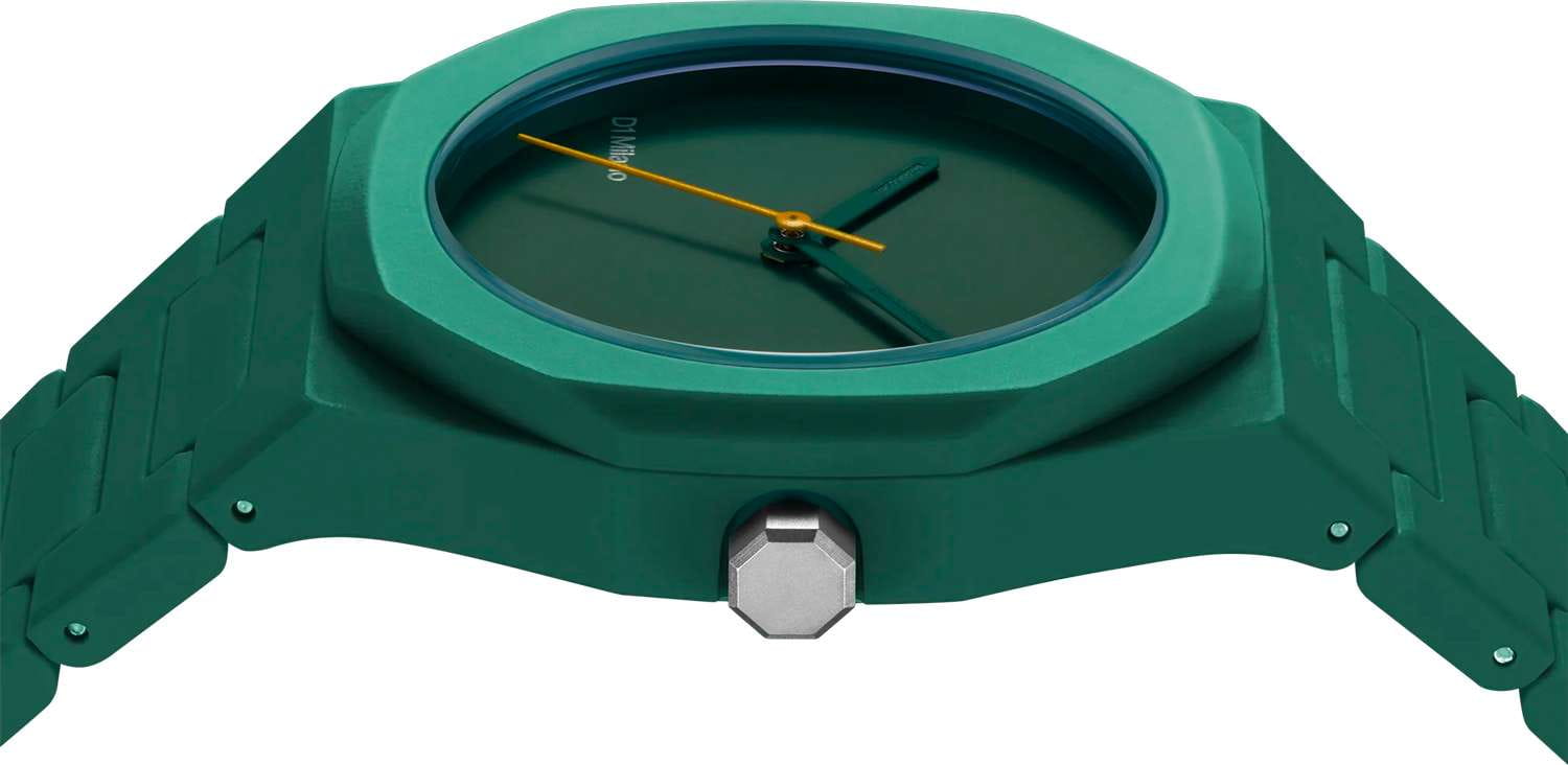 Часы D1 Milano Polycarbon PCBU10 – молодежные часы в стиле унисекс для повседневных образов, стильные и комфортные. Модель имеет зеленый корпус и браслет из поликарбоната с покрытием Софт-Тач.. Циферблат лаконичный с индексами в виде штрихов, защищен минеральным стекломМинеральное стеклоМинеральное стекло представляет собой искусственно выращенный минерал кварца. Такое стекло отличается особой устойчивостью к повреждениям и царапинам. Уступает по некоторым качествам сапфировому стеклу. с антибликовым покрытием. Стальная задняя крышка на 4 винтах. Пластиковый браслет на застёжке-бабочке с кнопкамиЗастёжка "бабочка"Такой вид застёжки дополняется предохранителями, помогающими избежать случайного раскрытия браслета. Обладают изящным исполнением. .