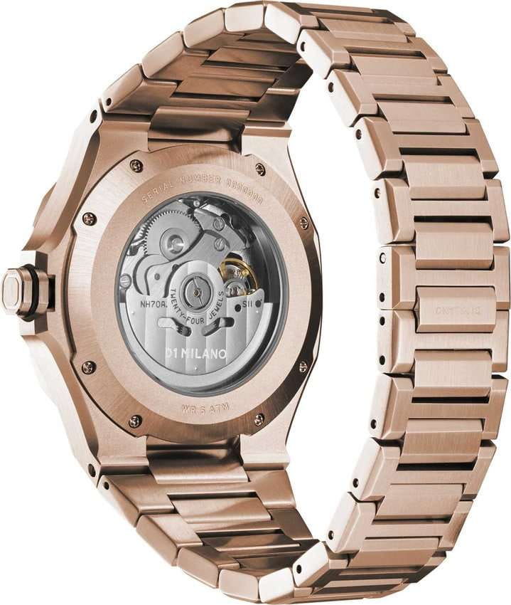 Часы D1 Milano SKBJ12 — это эффектные механические мужские часы, разработанные для ценителей уникальных аксессуаров. Их утонченный дизайн и высокое качество исполнения делают эти часы незаменимым элементом вашего стиля. Изготовленные в Италии, они оснащены надежным механизмом Seiko TMI NH70A с автоподзаводом, обеспечивающими запас хода до 41 часа. Частота работы механизма составляет 21600 полуколебаний в час. Часы имеют корпус из нержавеющей стали 316L с PVDPVDУльтратонкое покрытие наносится в технике вакуумного напыления, сочетает в себе нитрид титана особой прочности со слоем золота или оксида хрома. Несёт в себе декоративную или защитную функцию. покрытием, что гарантирует долговечность и стойкость к внешним воздействиям. Черный скелетонизированный циферблат защищен сапфировым стекломСапфировое стеклоПрочный и надёжный материал из кристалла сапфира синтетического происхождения, характеризующийся особой твёрдостью и устойчивостью к царапинам и повреждениям. с антибликовым покрытием, подчеркивающим элегантность и изысканность модели. Метки в виде штрихов и прозрачная задняя крышка, закрепленная на 8 винтах, придают часам особый шарм. Стальной браслет с PVDPVDУльтратонкое покрытие наносится в технике вакуумного напыления, сочетает в себе нитрид титана особой прочности со слоем золота или оксида хрома. Несёт в себе декоративную или защитную функцию. покрытием и раскладной застёжкойРаскладная застёжкаТакой тип застёжки используется только на браслетах из металла. Она никогда не раскрывается полностью, происходит разделение на 2 и более частей. Раскладывающая застёжка снизит вероятность потери часов к минимуму. обеспечивает комфортное и надежное ношение. Водозащита до 50 метров делает эти часы подходящими для повседневного использования.