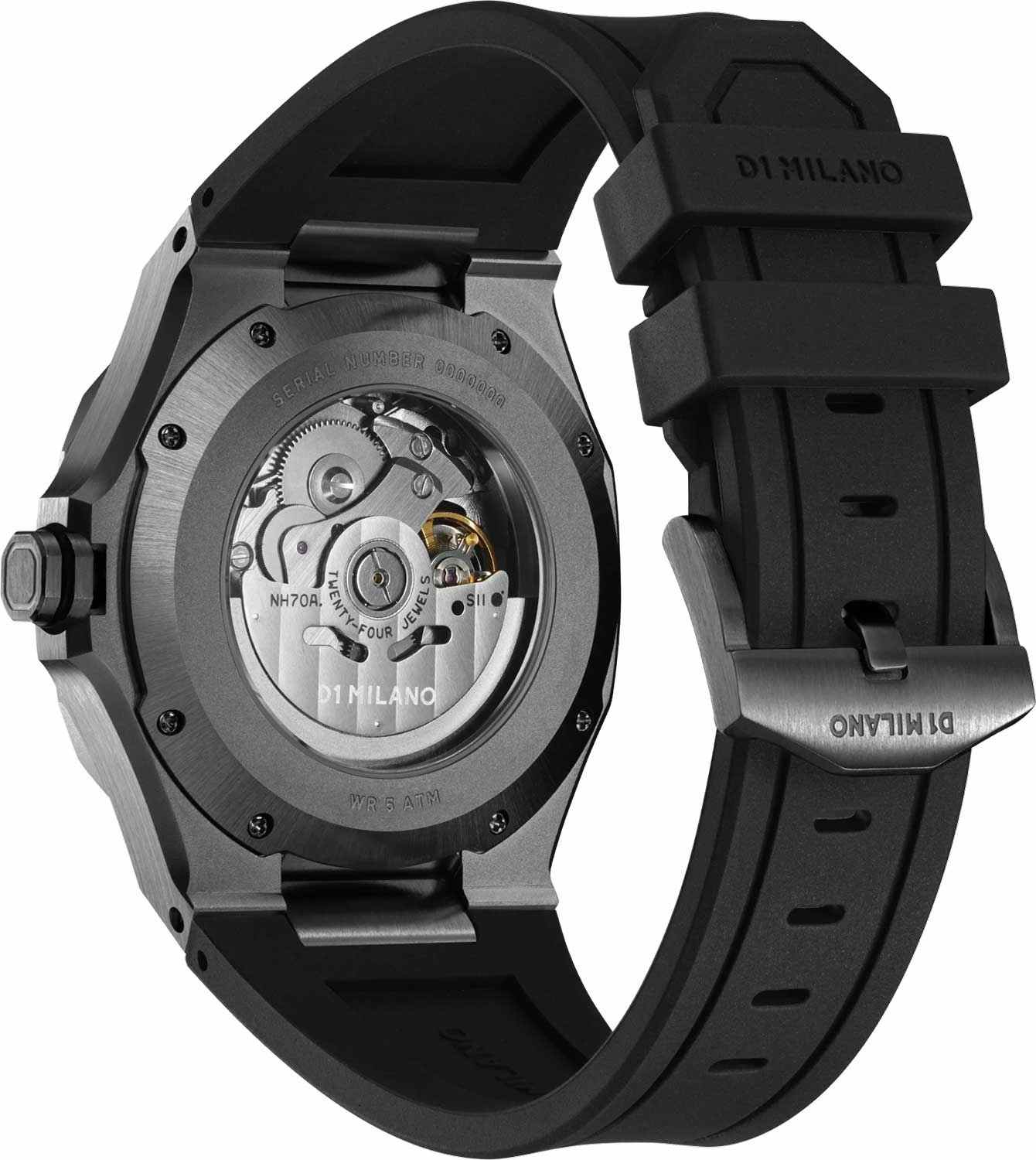 Часы D1 Milano SKRJ11 — это эффектные механические мужские часы, разработанные для ценителей уникальных аксессуаров. Их утонченный дизайн и высокое качество исполнения делают эти часы незаменимым элементом вашего стиля. Изготовленные в Италии, они оснащены надежным механизмом Seiko TMI NH70-L с автоподзаводом, обеспечивающими запас хода до 41 часа. Частота работы механизма составляет 21600 полуколебаний в час. Часы имеют корпус из нержавеющей стали 316L с PVDPVDУльтратонкое покрытие наносится в технике вакуумного напыления, сочетает в себе нитрид титана особой прочности со слоем золота или оксида хрома. Несёт в себе декоративную или защитную функцию. покрытием, что гарантирует долговечность и стойкость к внешним воздействиям. Черный скелетонизированный циферблат защищен сапфировым стекломСапфировое стеклоПрочный и надёжный материал из кристалла сапфира синтетического происхождения, характеризующийся особой твёрдостью и устойчивостью к царапинам и повреждениям. с антибликовым покрытием, подчеркивающим элегантность и изысканность модели. Метки в виде штрихов и прозрачная задняя крышка, закрепленная на 8 винтах, придают часам особый шарм. Резиновый ремешок черного цвета со стандартной застежкой обеспечивает комфортное и надежное ношение. Водозащита до 50 метров делает эти часы подходящими для повседневного использования.