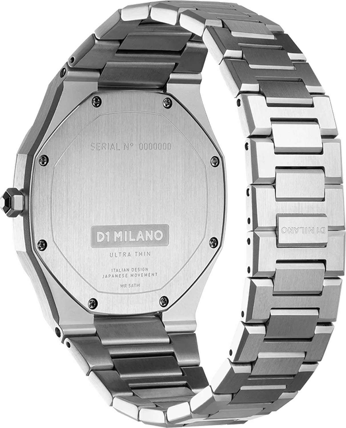 Часы D1 Milano UTBJ14 — это уникальные кварцевые часы, которые подчеркнут ваш изысканный стиль. Эти наручные часы из коллекции Ultra Thin с эффектным монохромным дизайном станут выразительным акцентом вашего образа. Корпус диаметром 40 мм из нержавеющей стали придает часам современный и утонченный вид. Черный циферблат метками в виде штрихов, а серебристые хроматические стрелки и индексы создают стильный контраст, подчёркивая элегантность модели. Задняя крышка из нержавеющей стали закреплена на 8-х винтах и дополнена индивидуальным серийным номером, что подчеркивает уникальность каждого экземпляра. Стальной браслет с раскладной застёжкойРаскладная застёжкаТакой тип застёжки используется только на браслетах из металла. Она никогда не раскрывается полностью, происходит разделение на 2 и более частей. Раскладывающая застёжка снизит вероятность потери часов к минимуму. обеспечивает надежность и комфорт в повседневном использовании. Сапфировое стеклоСапфировое стеклоПрочный и надёжный материал из кристалла сапфира синтетического происхождения, характеризующийся особой твёрдостью и устойчивостью к царапинам и повреждениям. с антибликовым покрытием защищает циферблат, а водозащита до 50WR делает эти часы практичным выбором для любых условий. Благодаря калибру Miyota 1L22, они отличаются точностью и надежностью. Эти итальянские часы представляют собой идеальное сочетание традиционного мастерства и инновационного подхода, воплощая в себе новый взгляд на классическую элегантность.