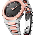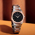 Наручные часы D1 Milano UTBU03 сочетают в себе элегантный дизайн и современные технологии. Модель обладает корпусом диаметром 38 мм, изготовленным из нержавеющей стали, что обеспечивает высокую устойчивость к внешним воздействиям. БезельБезельВнешний ободок, закрепляющий стекло. В спортивных часах так называется поворотное кольцо с делениями на циферблате, выполняет роль таймера – замеряет отрезки времени на шкале. Неподвижный безель – элемент декора. Однонаправленно вращающийся безель на дайверских часах позволяет фиксировать моменты погружения и выныривания на поверхность. с PVD-покрытиемPVDУльтратонкое покрытие наносится в технике вакуумного напыления, сочетает в себе нитрид титана особой прочности со слоем золота или оксида хрома. Несёт в себе декоративную или защитную функцию.. Циферблат черного цвета украшен метками в виде штрихов, а его защиту обеспечивает прочное сапфировое стеклоСапфировое стеклоПрочный и надёжный материал из кристалла сапфира синтетического происхождения, характеризующийся особой твёрдостью и устойчивостью к царапинам и повреждениям., известное своей устойчивостью к царапинам. Часы оснащены кварцевым механизмом, гарантирующим точность хода без необходимости подзаводки. Браслет выполнен из нержавеющей стали на раскладной застёжкеРаскладная застёжкаТакой тип застёжки используется только на браслетах из металла. Она никогда не раскрывается полностью, происходит разделение на 2 и более частей. Раскладывающая застёжка снизит вероятность потери часов к минимуму., что обеспечивает комфортное ношение на протяжении всего дня. Водонепроницаемость модели составляет 50 метров, что позволяет использовать часы в повседневной жизни, включая контакт с водой при мытье рук или дожде, однако не рекомендуется для погружений или активных водных видов спорта. Изготовленные в Италии, эти ультратонкие часы станут стильным аксессуаром как для мужчин, так и для женщин, идеально дополняя образ в любой ситуации.