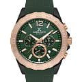 Мужские кварцевые часы-хронограф Daniel Klein — это удобный и многофункциональный аксессуар. Корпус диаметром 44 мм выполнен из металла с IP-покрытиемIP-покрытиеМетод ионного напыления. Демонстрирует повышенную устойчивость к истиранию, окислению и химическим веществам. Под воздействием высокого давления и температуры около 1500°C молекулы металла надёжно соединяются с частицами корпуса часов.. Циферблат зелёного цвета выполнен по технологии Sunray («солнечные лучи») и оформлен штрихами, арабской цифрой 12, стрелками и тремя субциферблатами хронографа. Присутствуют индикаторы 24-часового формата времени и тахиметрТахиметрРазмеченная шкала, располагается на ободке или безеле часов. Тахиметр позволяет рассчитать скорость на определённом участке пути, расстояние измеряется в километрах или милях. на безеле. Окошко даты расположено между 4 и 5 часами. Стрелки и метки с люминесцентным покрытиемЛюминесцентное покрытиеПозволяет считывать показания времени в темноте. Производители наносят на стрелки, часовые индексы, безель или поверхность циферблата светонакопительный состав, дающий холодное свечение., обеспечивающим хорошую читаемость в темноте. Циферблат защищён минеральным стекломМинеральное стеклоМинеральное стекло представляет собой искусственно выращенный минерал кварца. Такое стекло отличается особой устойчивостью к повреждениям и царапинам. Уступает по некоторым качествам сапфировому стеклу.. Заводная головка рифлёная, с защитой. Часы оснащены силиконовым ремешком на классической пряжке. Водонепроницаемость 50 м позволяет использовать часы в повседневных условиях. Идеальный выбор для тех, кто ценит турецкое качество и универсальный дизайн.