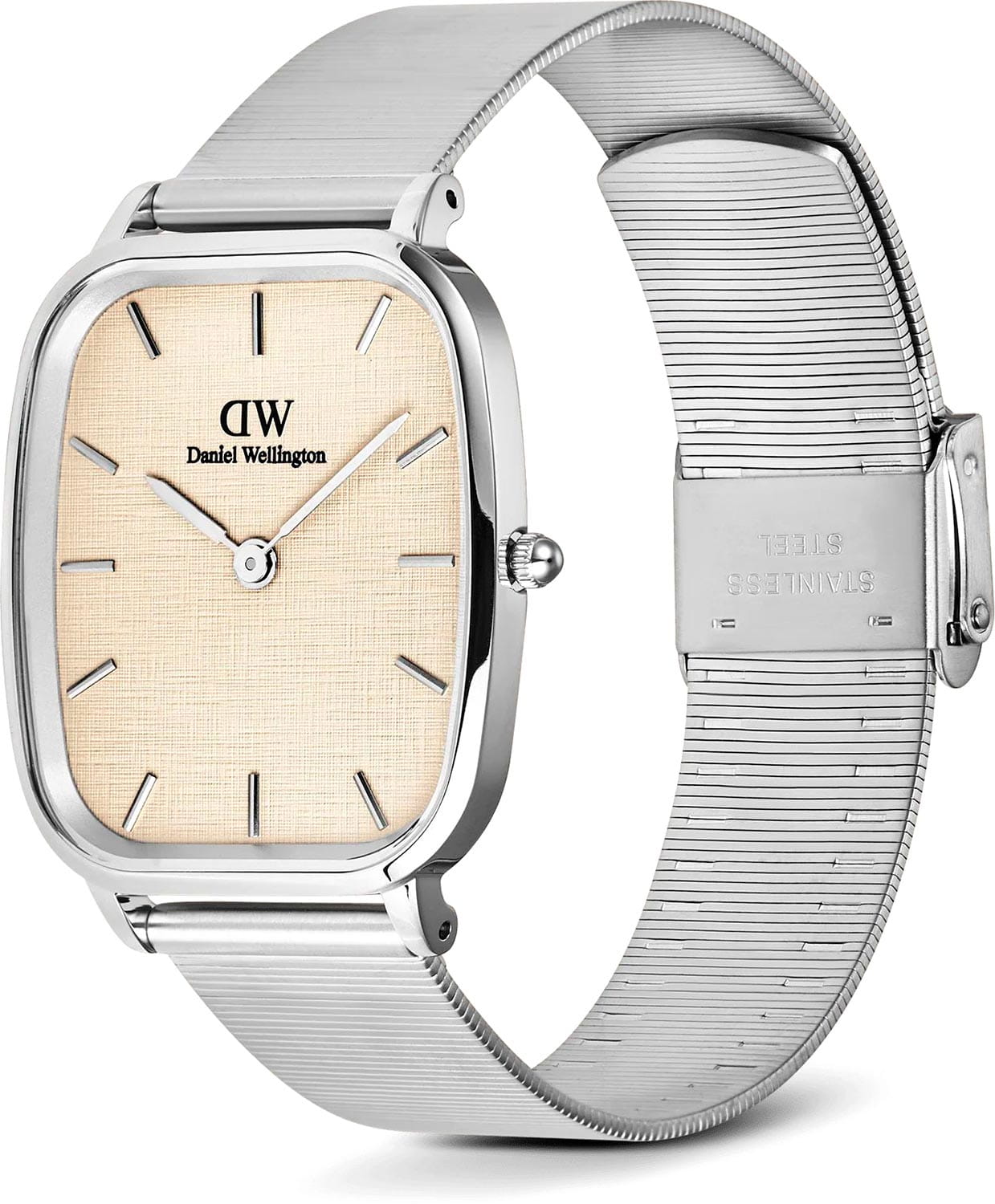 Daniel Wellington Marlon Wire Linen Silver — стильные унисекс-часы с утончённым дизайном, в которых сочетаются строгие линии и изысканная лёгкость. Прямоугольный корпус размером 32×36 мм выполнен из нержавеющей стали, создающим мягкий и благородный блеск.Минеральное стеклоМинеральное стеклоМинеральное стекло представляет собой искусственно выращенный минерал кварца. Такое стекло отличается особой устойчивостью к повреждениям и царапинам. Уступает по некоторым качествам сапфировому стеклу. устойчивое к мелким механическим повреждениям. Циферблат Linen оформлен в светлом тоне с изящной текстурой «лён», подчёркивающей скандинавский минимализм и добавляющей образу утончённости. Строгие метки и тонкие стрелки поддерживают гармонию линий. Модель оснащена надёжным кварцевым механизмом, гарантирующим точность хода. Браслет Wire выполнен в виде тонкой миланской сетки с PVD-покрытиемPVDУльтратонкое покрытие наносится в технике вакуумного напыления, сочетает в себе нитрид титана особой прочности со слоем золота или оксида хрома. Несёт в себе декоративную или защитную функцию. в цвете розового золота на раскладном замкеРаскладной замокДанный вариант застежки используется только на часах с металлическим браслетом. Отличительная особенность такого крепления в том, что длина браслета становится универсальной и вы можете самостоятельно отрегулировать нужный вам размер – застежка просто двигается по браслету часов.. Daniel Wellington — универсальный аксессуар для ценителей лаконичного стиля, идеально подходящий как к повседневным, так и к более торжественным образам.